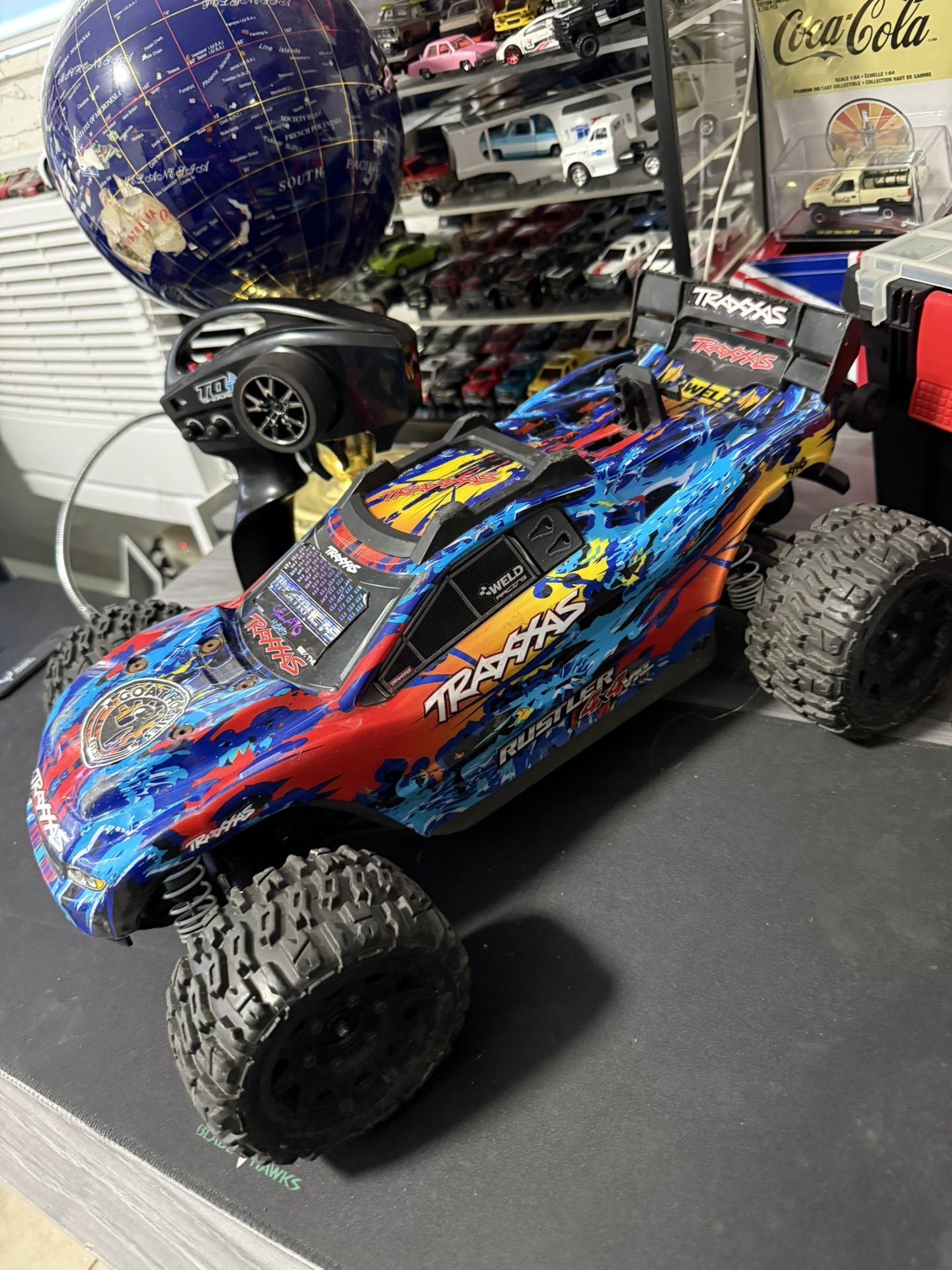 Traxxas rustler 4x4 3s rc pretty Fast comes with extra tool stuff fresh new battery and good tires body needs repair on back can all u need is battery adapter from traxxas to blue plug lmk