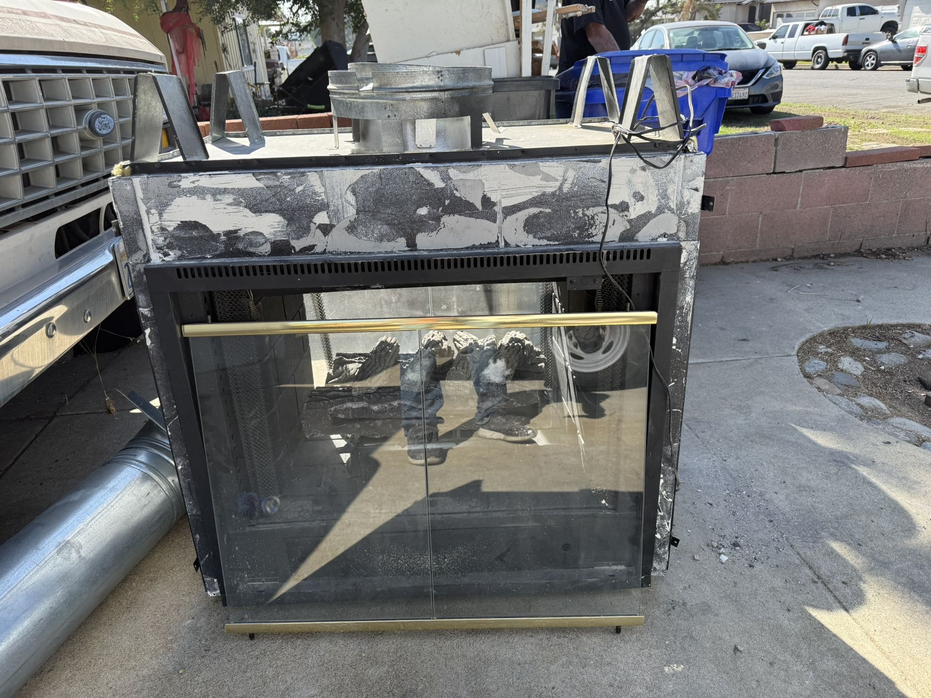 Double Sided Gas Fireplace This is a gas burning fireplace. It’s double-sided so it’s see-through. It works great. Everything‘s good on. It comes with all the accessories that you see and deducting. The cosmetic is just from the old Tile that was there. It will be covered up upon a new install.