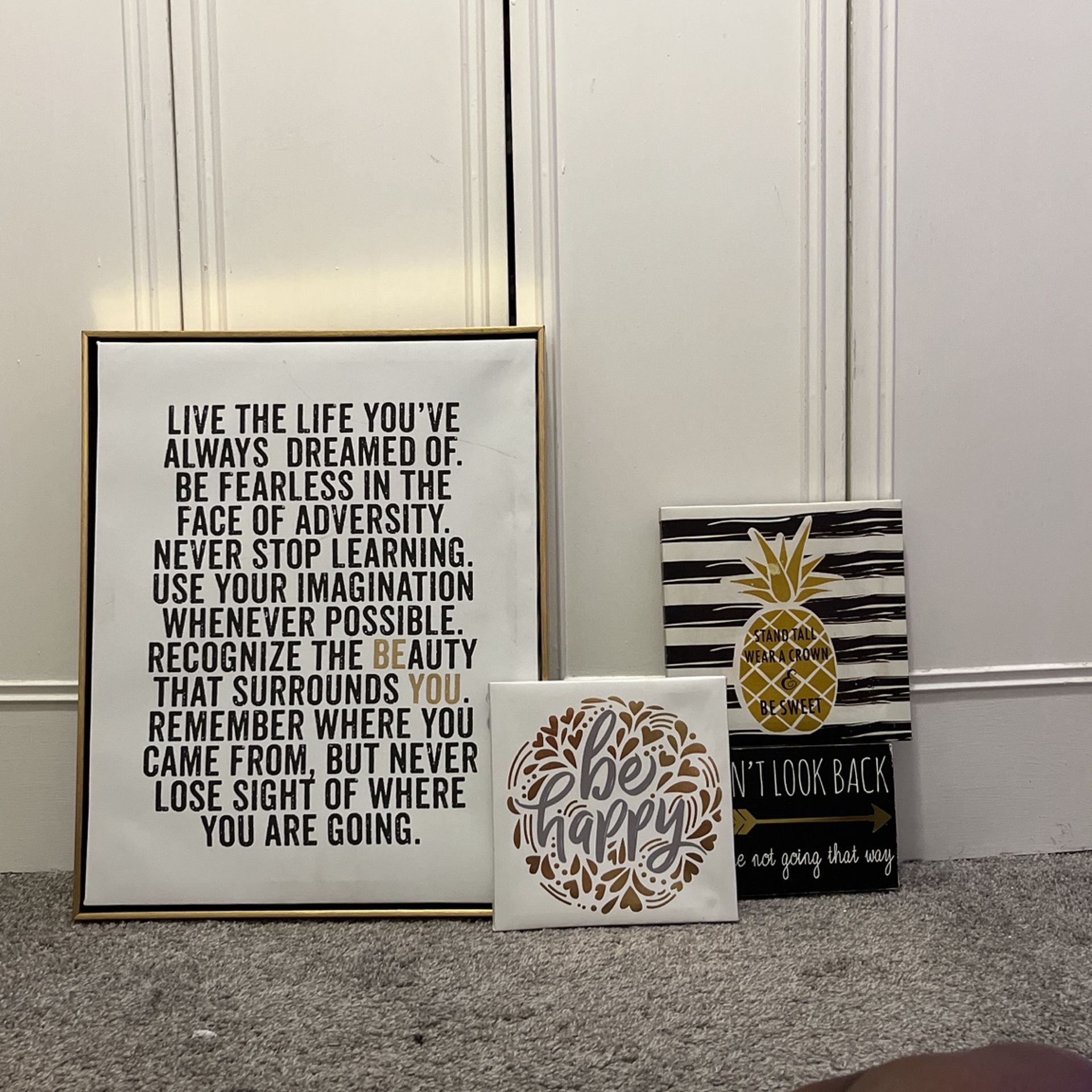 Gold Set home decor framed photos, $5 each, $15 for whole set. Framed Photo,Live the life you’ve always dreamed of measurements, 20X16. Framed Photo Don’t look back you’re not going that way measurements, 7X6. Framed Photo Stand tall wear a crown & be sweet measurements, 9X9. Framed Photo be happy measurements, 8X8.