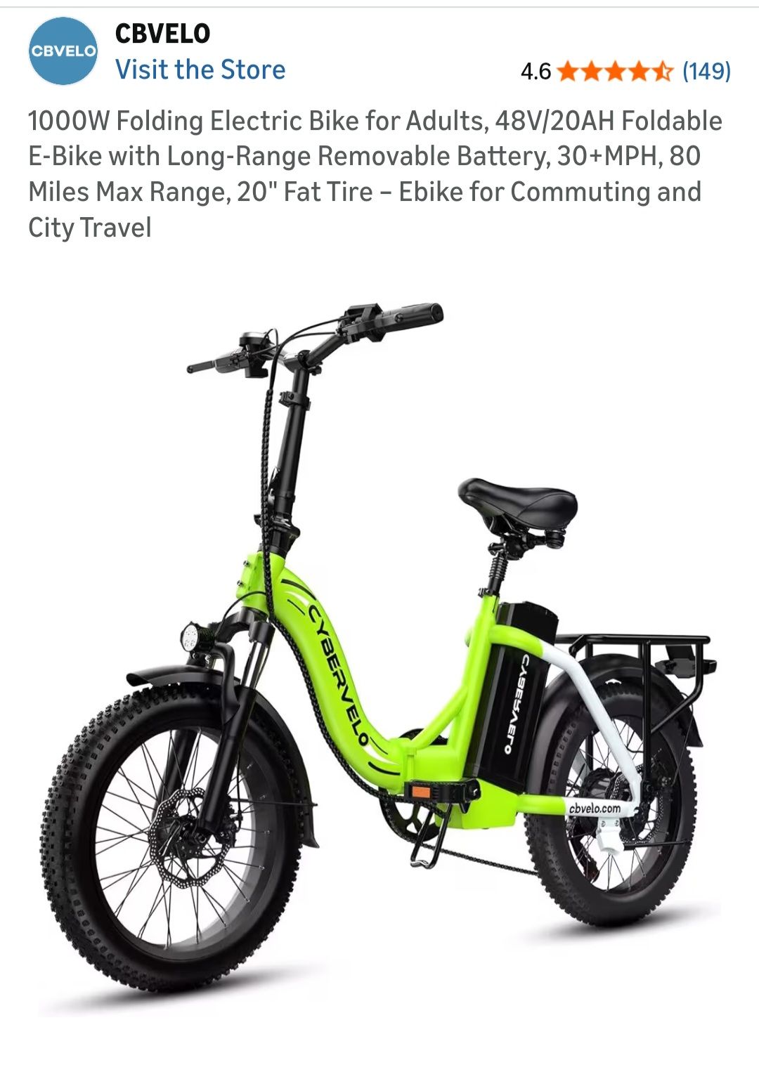 Cbvello electric bike purchased from amazon. Barely ridden with normal wear. Max speed is 38mph