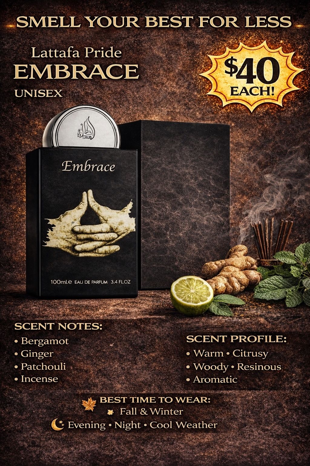 π₯ COMMON β SMELL YOUR BEST FOR LESS π₯ β¨ Lattafa Pride β EMBRACE (EDP 100ml) π² $40 Each A smooth, warm, and sophisticated unisex fragrance from the oriental family β perfect for those who love rich, comforting scents. Scent Profile: β’ Top Notes: Bergamot, Ginger, Artemisia β’ Heart Notes: Patchouli, Fir Balsam, Incense β’ Base Vibe: Warm, resinous, woody, slightly sweet Unisex: Yes Best Time to Wear: Fall & Winter β’ Evenings β’ Date nights β’ Cool weather Smell high-end without paying high-end. Level up your collection today! π New Beginning Liquidation LLC π Call/Text Roger π Delivery available starting at $75. β³ While supplies last!