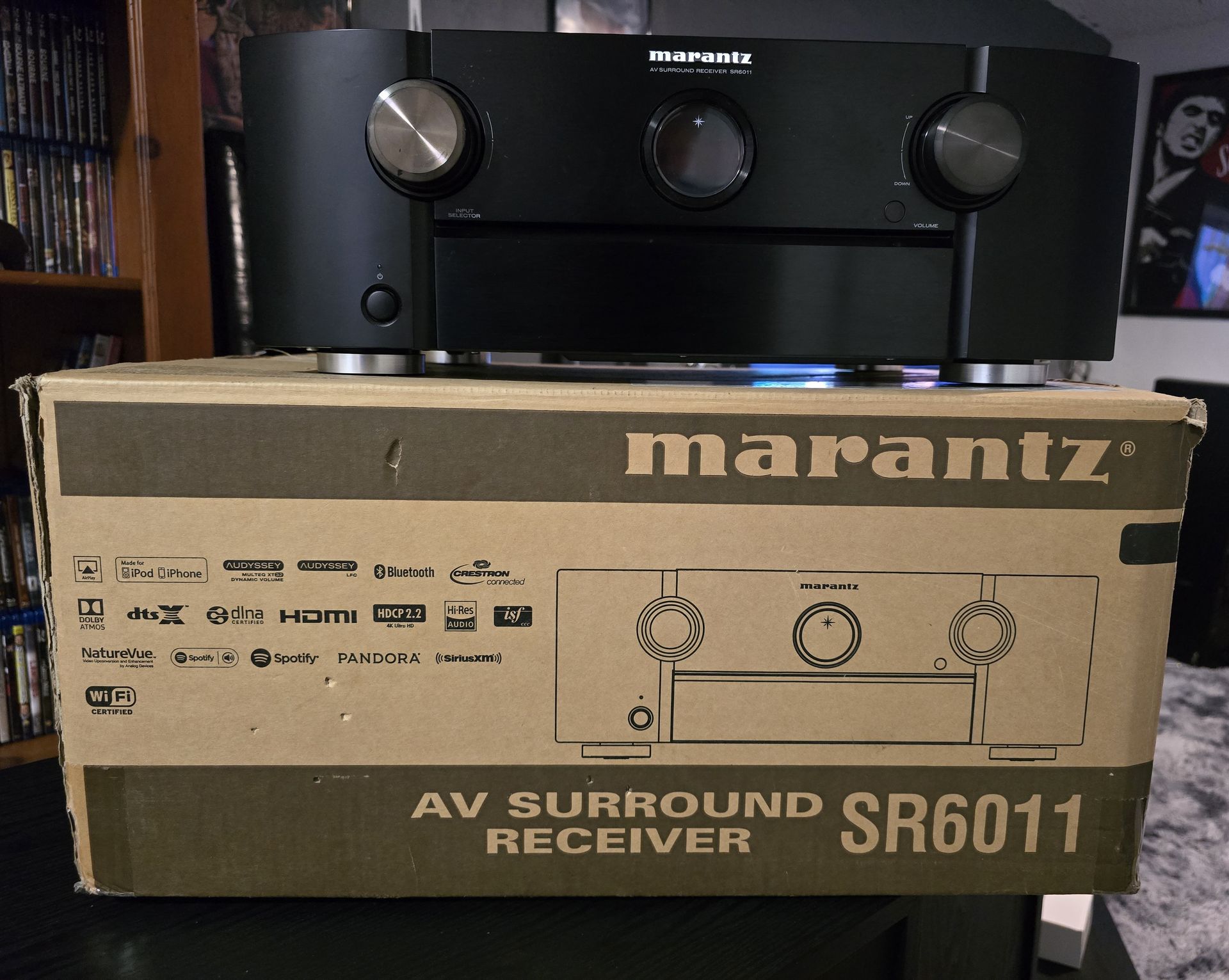 Marantz SR6011 good condition 9.2-channel home theater receiver with Wi-Fi®, Bluetooth®, Apple® AirPlay®, and Dolby Atmos® 4.5 out of 5 stars(9-channel amplifier 110 watts per channel into 8 ohms (20-20,000 Hz) at 0.08% THD, with 2 channels driven Dolby® and DTS® surround sound decoding Dolby Atmos and DTS:X for more enveloping home theater sound supports 5.1.2, 5.1.4, and 7.1.2 Atmos setups video upconversion (up to 1080p and 4K) for analog and HDMI sources Audyssey "Platinum" speaker calibration and system optimization includes: MultEQ® XT32 auto setup and room calibration delivers balanced, dynamic sound with enhanced surround performance for as many as eight seating positions (expandable to 32 seating positions with a professional installer) Digital Music Options: built-in Wi-Fi for listening to music from a networked PC, free internet radio, and music services includes support for Pandora, SiriusXM, and free internet radio streams with vTuner (subscription required for some services) firmware update needed to connect to Pandora: available now Spotify Connect lets you play Spotify's streaming music library through the receiver via your smartphone or tablet (requires Spotify app and a premium subscription) Apple AirPlay for streaming music from an iPhone®, iPad®, iPod touch® or computer running iTunes® built-in Bluetooth for wireless music listening with smartphones, tablets, and compatible computers front-panel USB input for connecting an iPod®, iPhone® or thumb drive direct digital connection for iPod or iPhone bypasses the device's digital-to-analog converter for better sound plays high-resolution digital music files via USB storage device or a networked computer (PCM up to 24-bit/192kHz resolution; DSD up to 5.6MHz .dsf files) MDAX2 (Marantz Dynamic Audio eXpander) for better sound from MP3s and other digital music files Multi-room Audio/Video: dual-room/dual-source output amp assign function lets you use the surround back speaker outputs for a second room while enjoying 5.1- or 7.1-channel sound in the main room line-level output for Zone 2 for use with additional receiver, amplifier, or powered speakers HDMI dual-zone switching for watching video content from different sources in two zones simultaneously supports 2nd zone output from digital sources Audio Performance Features: Marantz's Hyper Dynamic Amplifier Module (HDAM) offers improved dynamic range and detail while reducing noise current feedback circuit for accurate, natural sound at all volume levels Pure Direct mode turns off unused circuitry for cleaner audio signals bi-amp capability with compatible front speakers by reassigning "height" channels Connections: HDMI 2.0a audio/video switching: 8 in (includes 1 front-panel input), 2 out HDCP 2.2 technology ensures compatibility with 4K Ultra HD sources and TVs (all HDMI inputs and outputs) HDR-compatible for extended picture contrast and brightness with compatible 4K TVs and HDR-encoded content supports HDR10; Dolby Vision compatibility via future firmware update component video switching: 2 in, 1 out composite video switching: 4 in, 1 out (includes front-panel input) digital audio inputs: 2 optical and 2 coaxial 5 analog stereo RCA audio inputs phono input for connecting a turntable 7.1-channel preamp inputs 11.2-channel preamp outputs include outputs for 2 powered subwoofers front-panel USB port outputs for 11 speakers (Front L/R, Center, Surround L/R, Surround Back L/R, Height1 L/R, Height2 L/R) receiver can power a maximum of 9 channels at once Height speakers can be reassigned for Zone 2 or bi-amping compatible front speakers Ethernet port for wired network connection support for third-party control systems by Control4 and Crestron for home automation 1/4" headphone output detachable power cord General Features: 4K/60p and 3D video pass-through free Marantz remote app lets you use your Apple or Android™ device as a Wi-Fi remote Setup Assistant guides you through the initial connection process and settings intuitive, full-color on-screen guide 4 smart select function buttons for one-touch power-up, source selection and recall of volume and Audyssey configuration Video Select lets you listen to music while watching video from a different source HDMI standby pass-through allows HDMI switching without powering up receiver AM/FM tuner remote control