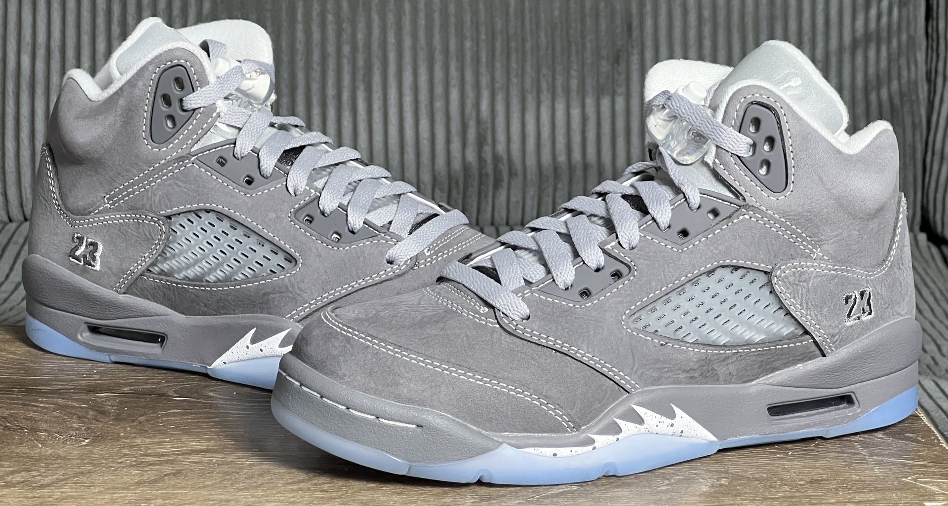 This grade school pair of sneakers is brand new in box. Proof of purchase can be provided. Style Code: 440888-002 Colorway: Light Graphite/White/Wolf Grey Release Date: 2/28/2026 Details: Made for big kids, the 2026 edition of the Air Jordan 5 Retro (GS) 'Wolf Grey' revives a neutral non-OG colorway of the legacy silhouette. The design is true to the original 2011 release, featuring a textured grey nubuck upper with translucent quarter panel netting and an embroidered '23' on the lateral heel. Jumpman branding appears on the reflective tongue and back heel. Speckled shark tooth detailing adorns the grey foam midsole, fitted with visible Air-Sole cushioning and supported underfoot by a translucent rubber outsole.
