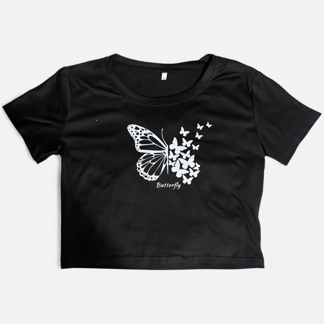 Women’s Large Black with White Vinyl Print Butterfly Short Sleeve Crop Top