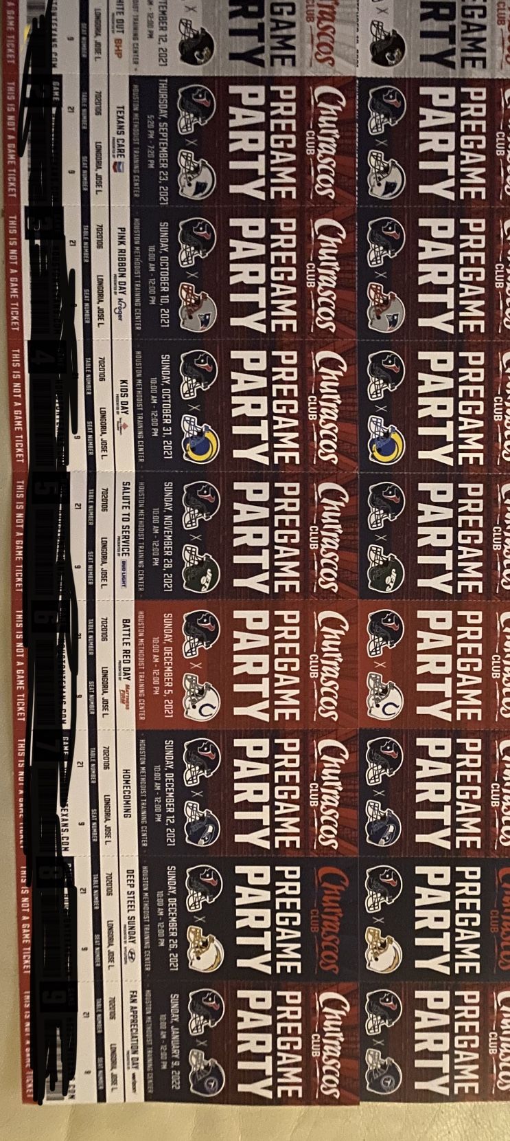 Texans season tickets and churrascos tickets section 620 seats 4 and 5 row G