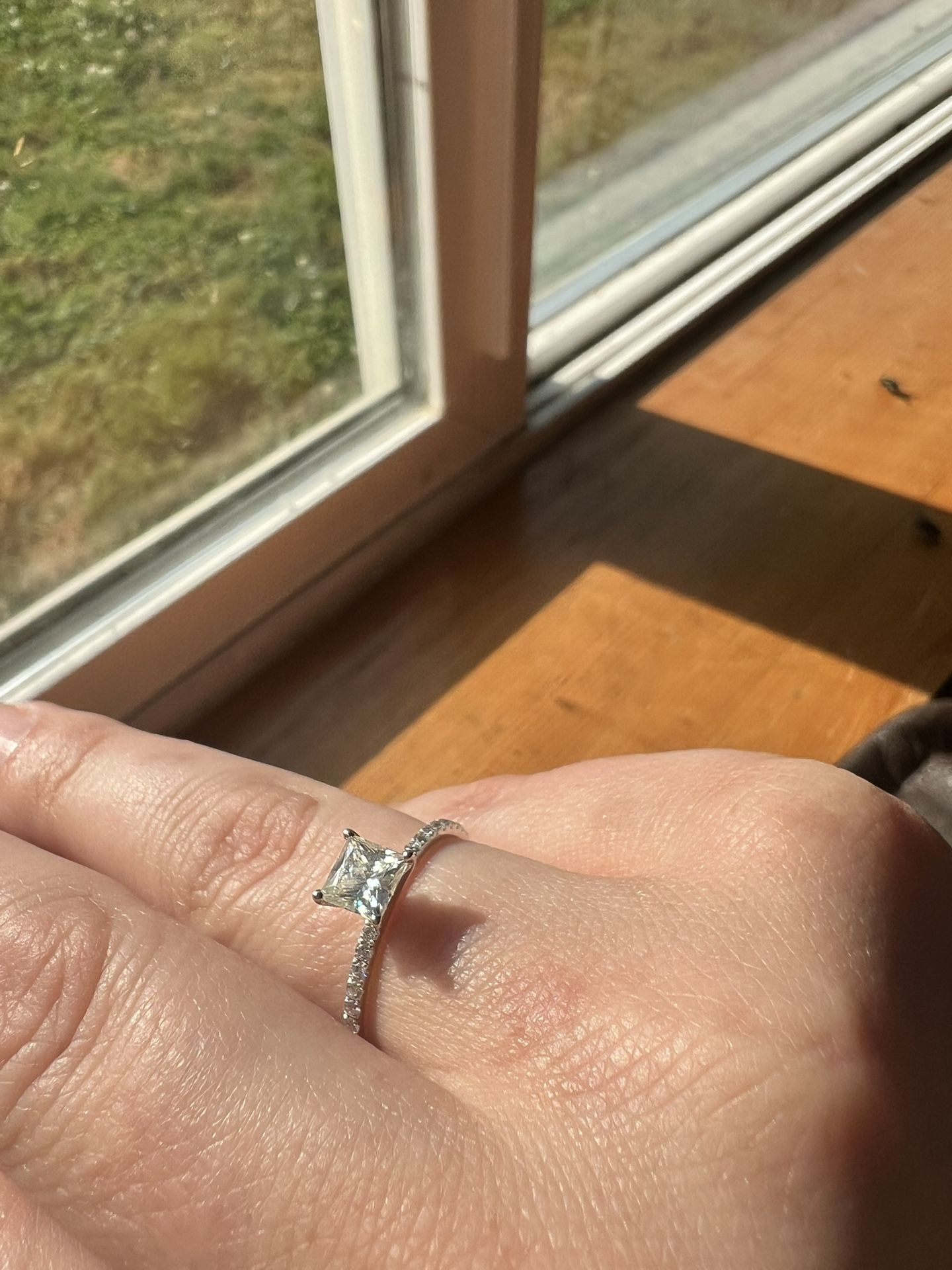 My first engagement ring. I recently was in a position to upgrade now I’m just looking to get some money back from my first one. Main stone is moissanite. Band is white gold. Surrounding stones are diamonds. Size 7