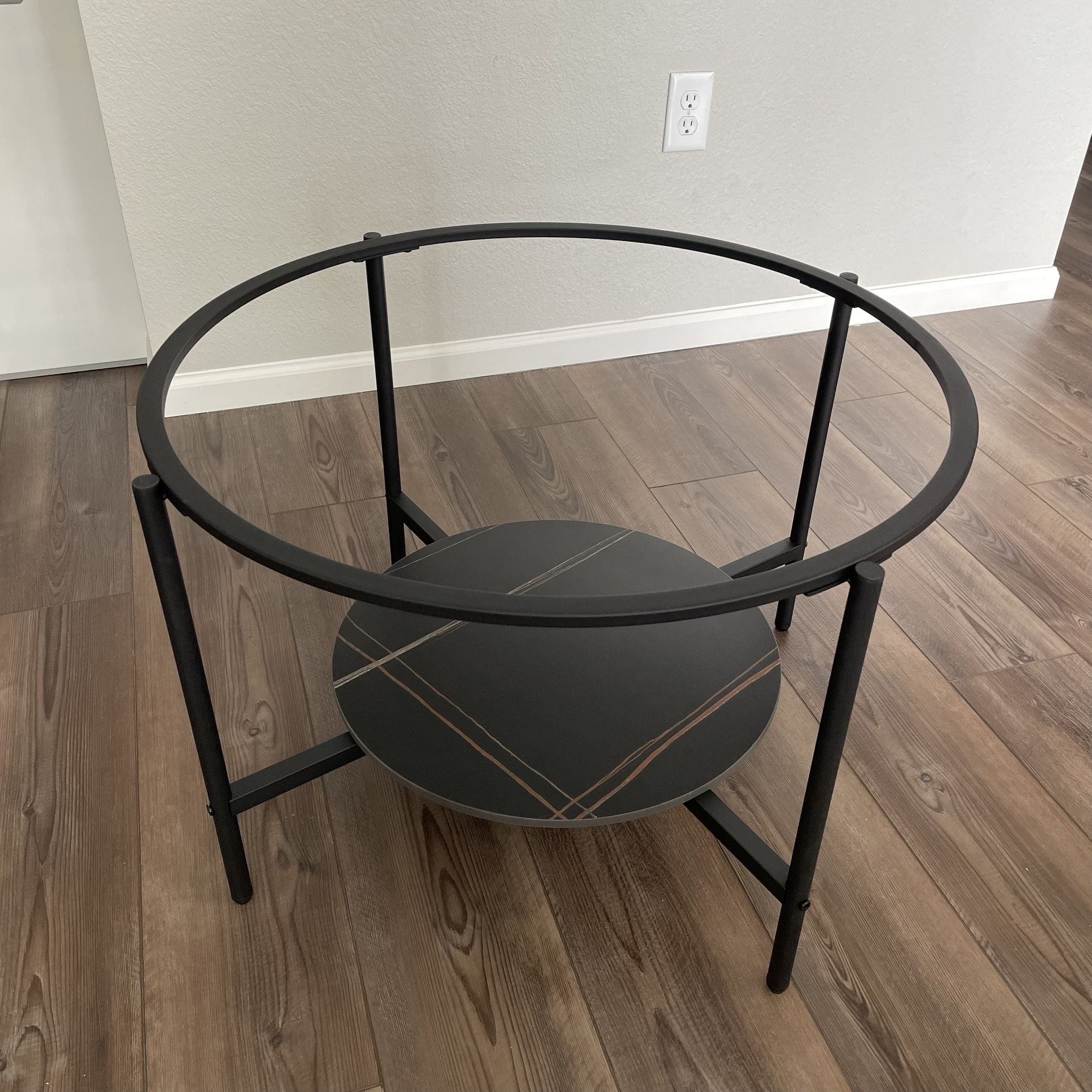 Coffee Table Base Details: - real stone - black metal base - black stone piece on bottom Condition: New Dimensions: Height: 18.7 in Diameter: 31.5 in I ordered a coffee table from Wayfair and the white stone top arrived broken. This includes only the base. Retail Price: $230 ; on sale now for $208 Please note: It’s currently unassembled, but comes with the hardware and assembly instructions