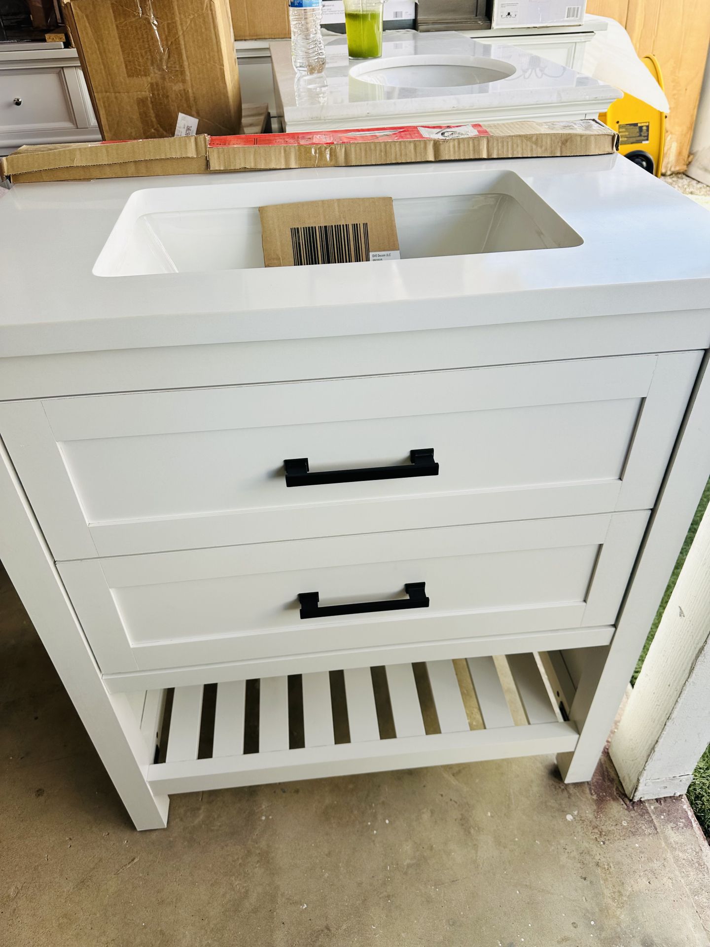 New vanity open box here only $350 including tax store price $469 Aslo we have the nice facet for only $80 no tax please if you lake this vanity massage me We locate in hesperia ca We taker Zelle or cash pickup only Home Decorators Aut 30 in. Single Sink White Bath Vanity with White Engineered Stone Top (Assembled)