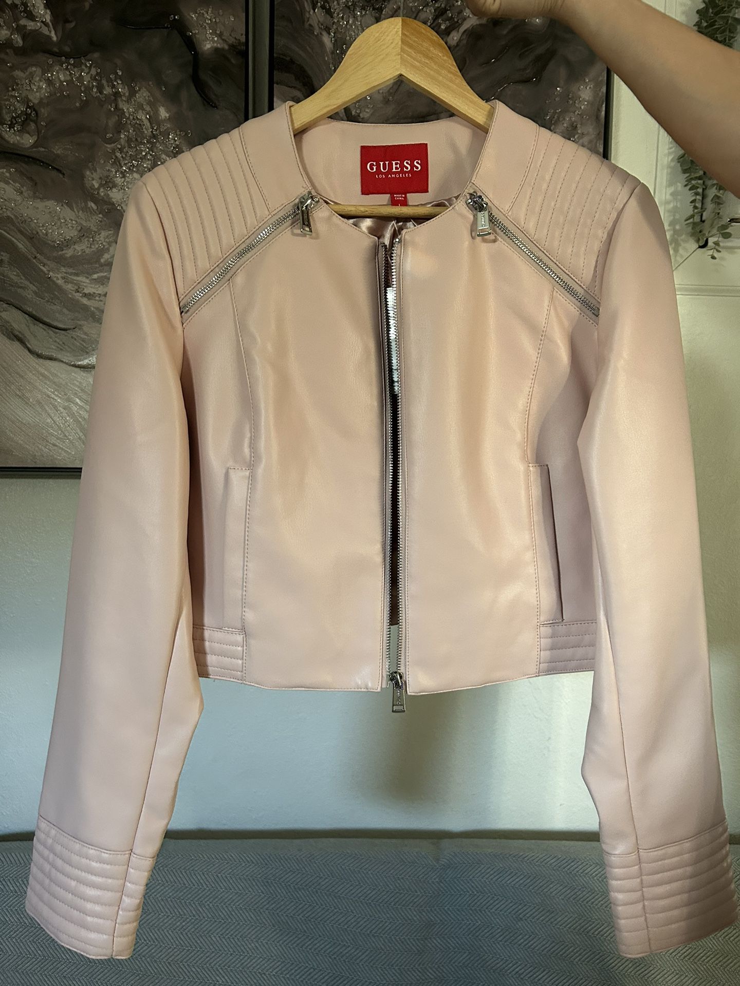 Women’s pink GUESS leather jacket size L Never worn - NEW $50 or best offer