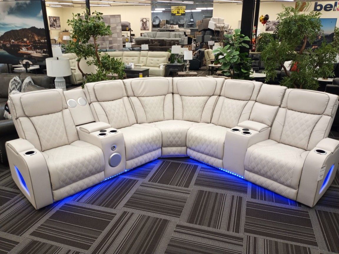 Cream Color Reclining Sectional w/ Massage LED Bluetooth Speakers & Wireless Charging Power Headrest Power Recliner Promo Price Ends 12/23/25 Available in Black Bel Furniture Pasadena TX Ask for Luis Wed-Sun