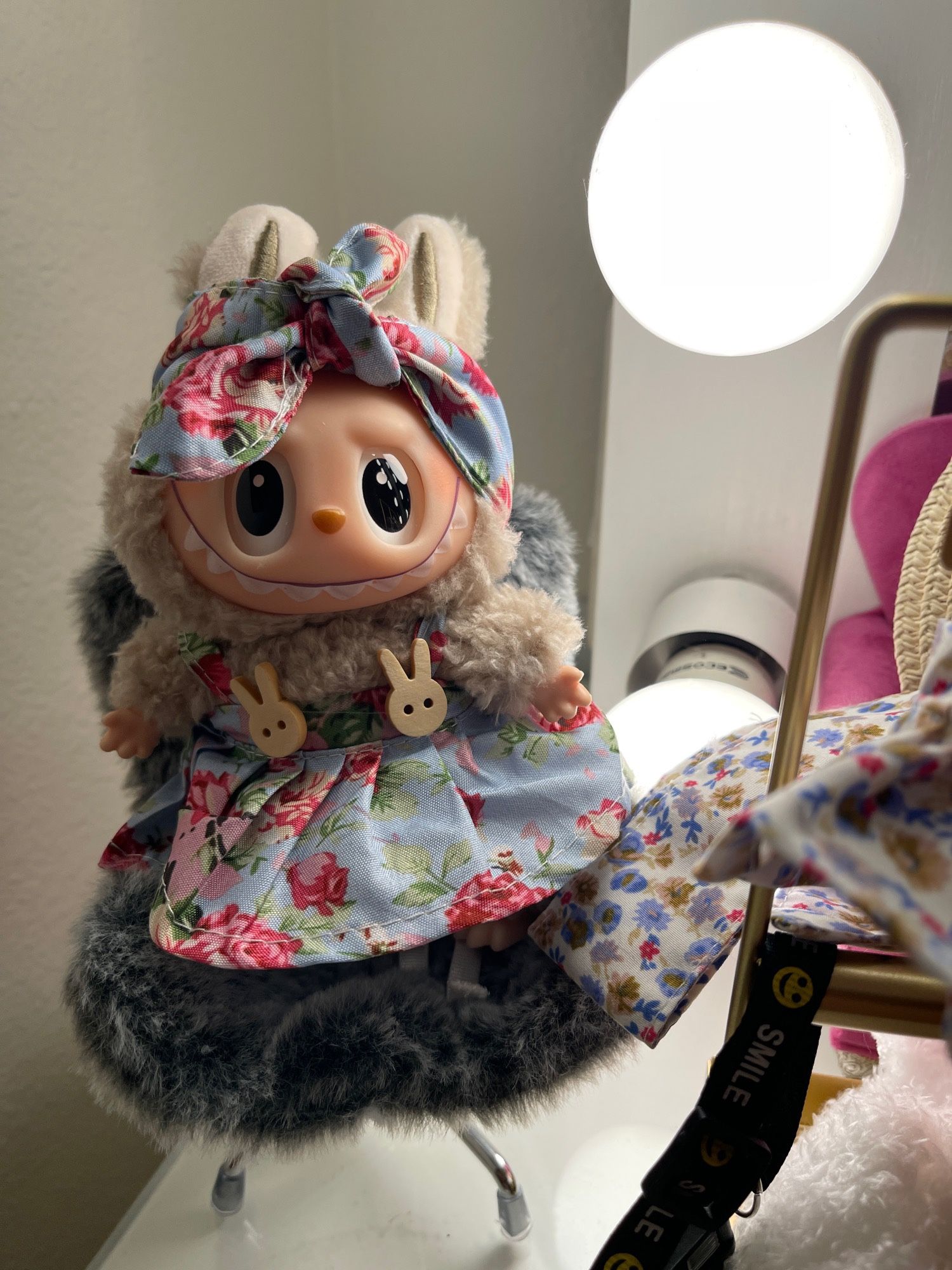Labubu rose pattern blue dress with a head wrap. Clothes only