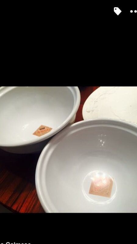 White glass bowls and plate One large bowl One medium bowl one large plate with a turkey design on it new never been used will meet