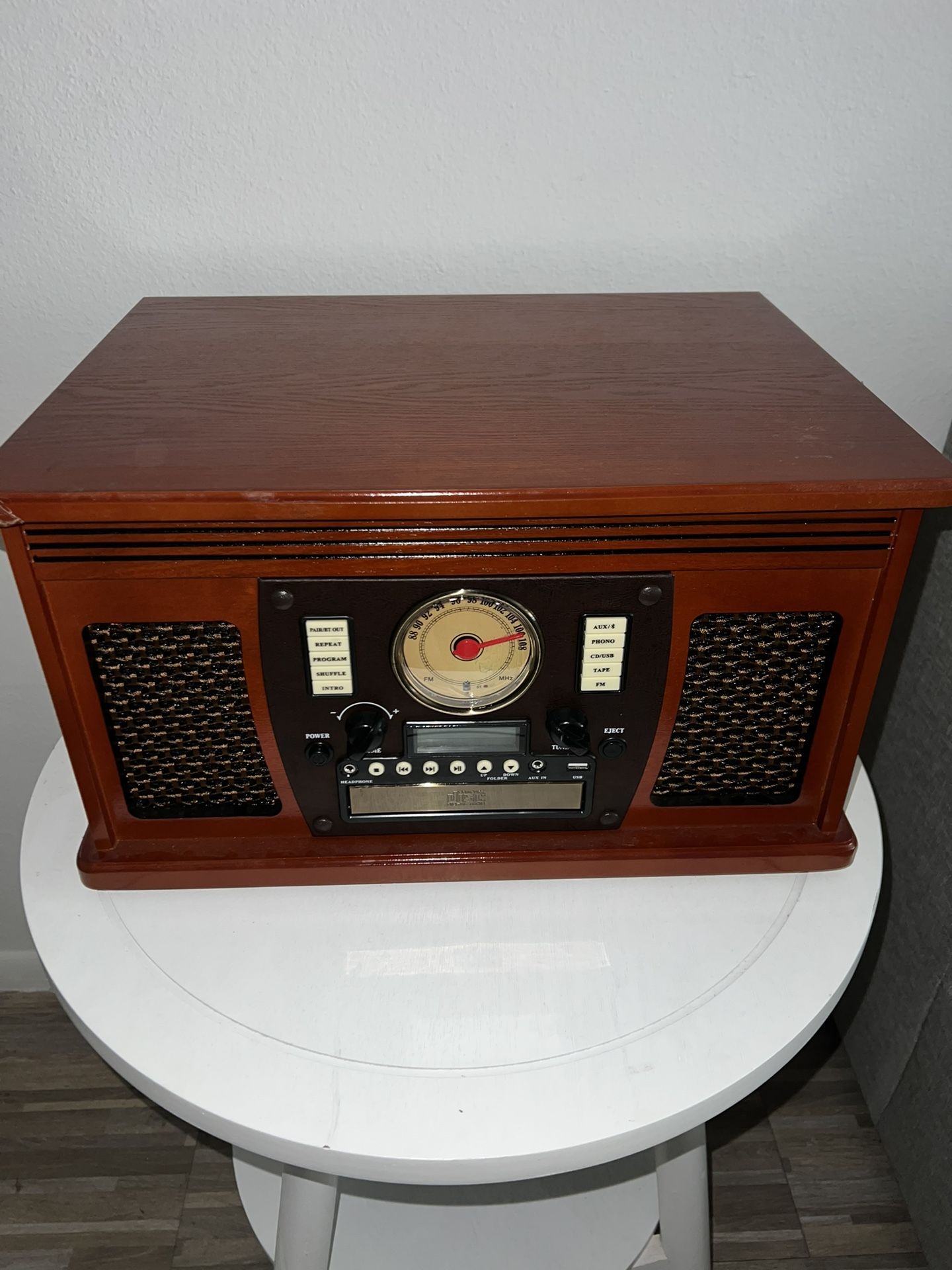 The Victrola Navigator Record Player combines modern technology with classic design. The Navigator features a 3-speed turntable, designed to play all your favorite 33 1/3, 45, and 78 RPM records! Listen to your favorite CDs and tapes with built-in cassette and CD players, or tune into your favorite station with the FM radio. Bluetooth connectivity also allows you to stream music from your smart device through the Navigator's built-in stereo speakers. Only damage it has is included in pictures- Used a couple times just collecting dust now reason why I want to get rid of it.