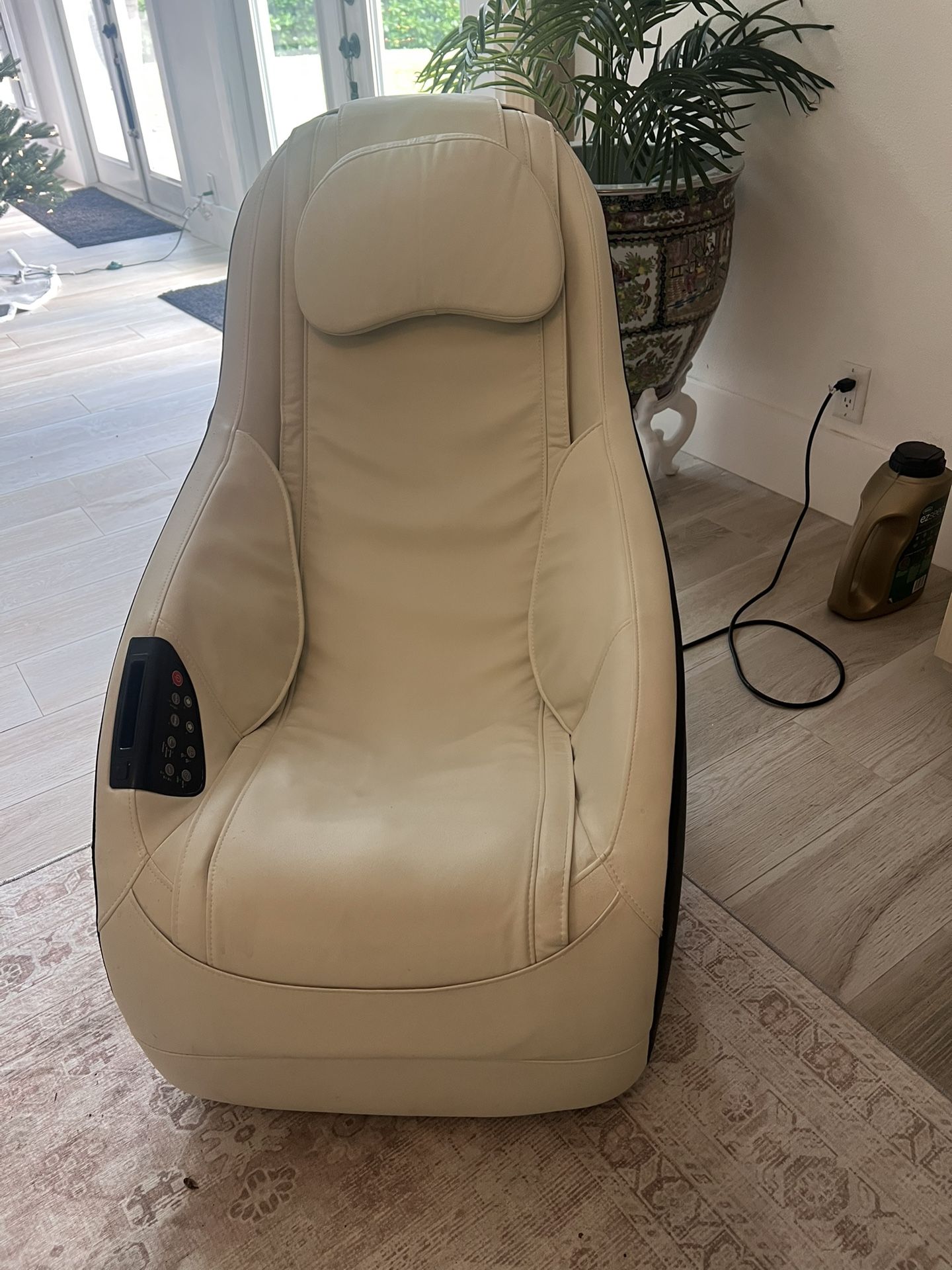 Powerful massage chair with blue tooth speakers Low profile Narrow chair but a fit person , even as tall as 6'6 fits in it with no problem Has wheels so can be tilted to move it easily No damage and works perfectly Easy pick up and great Xmas gift