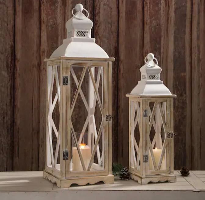 Decorative hanging candle lanterns white set of 2 (no glass) Great idea for the tabletop,shelf,stairs,patio,porch the white wood metal coating creates an farmhouse style will be an attractive home decoration for wedding ,party ,Christmas