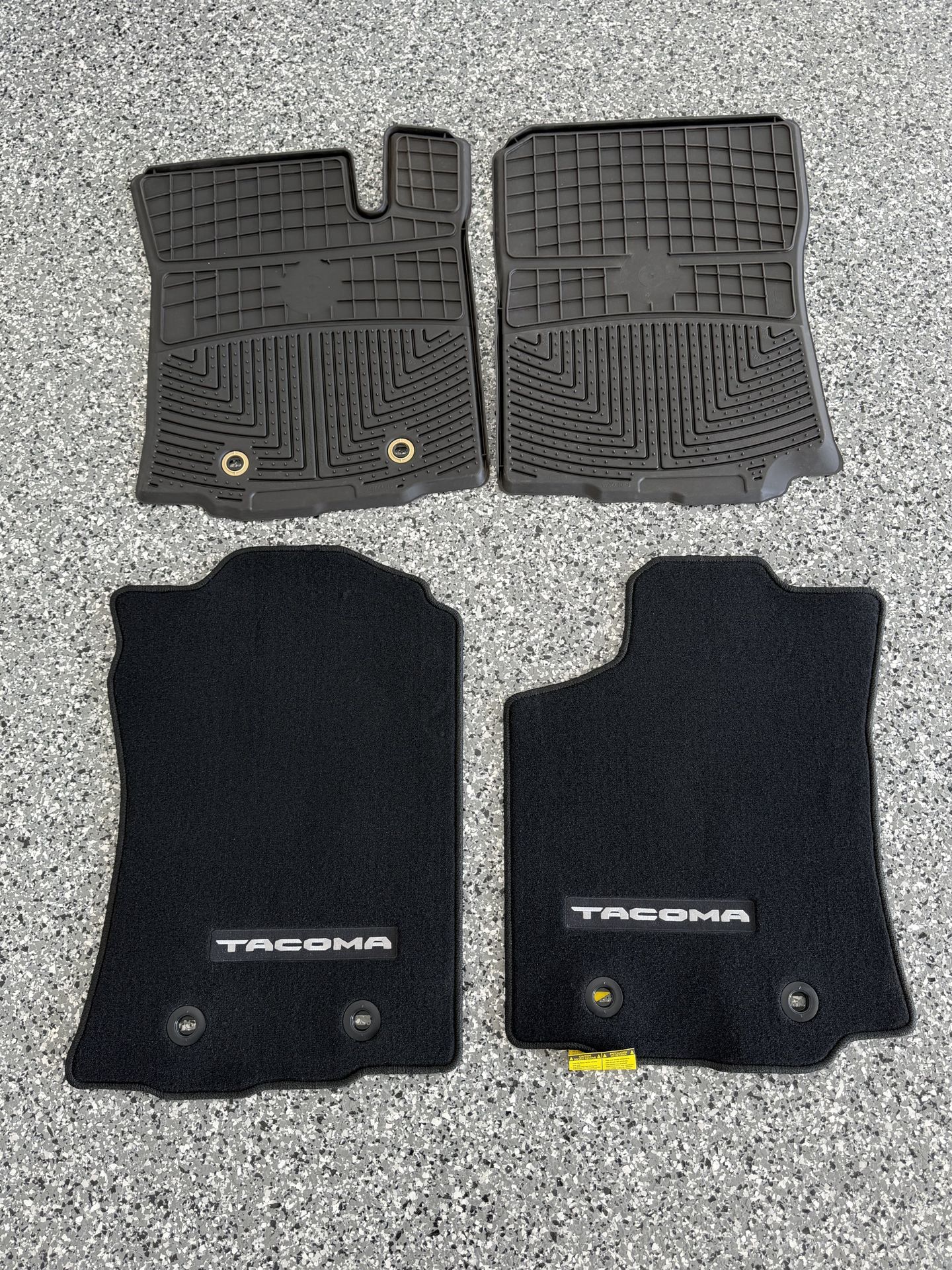2022 Toyota Tacoma front floor mats I have 2 brand new never used carpeted matts. The set price is $30 I have 2 lightly used Weathertech mats. The set price is $35 Purchase both for $60.
