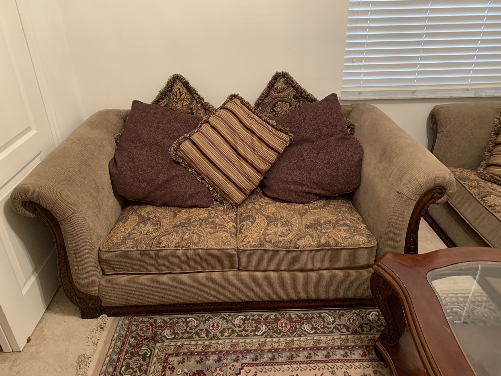 Love seat, couch, and matching coffee table for sale. Extremely comfortable, good condition. They are all made with mahogany so they are pretty heavy. Asking $150 obo