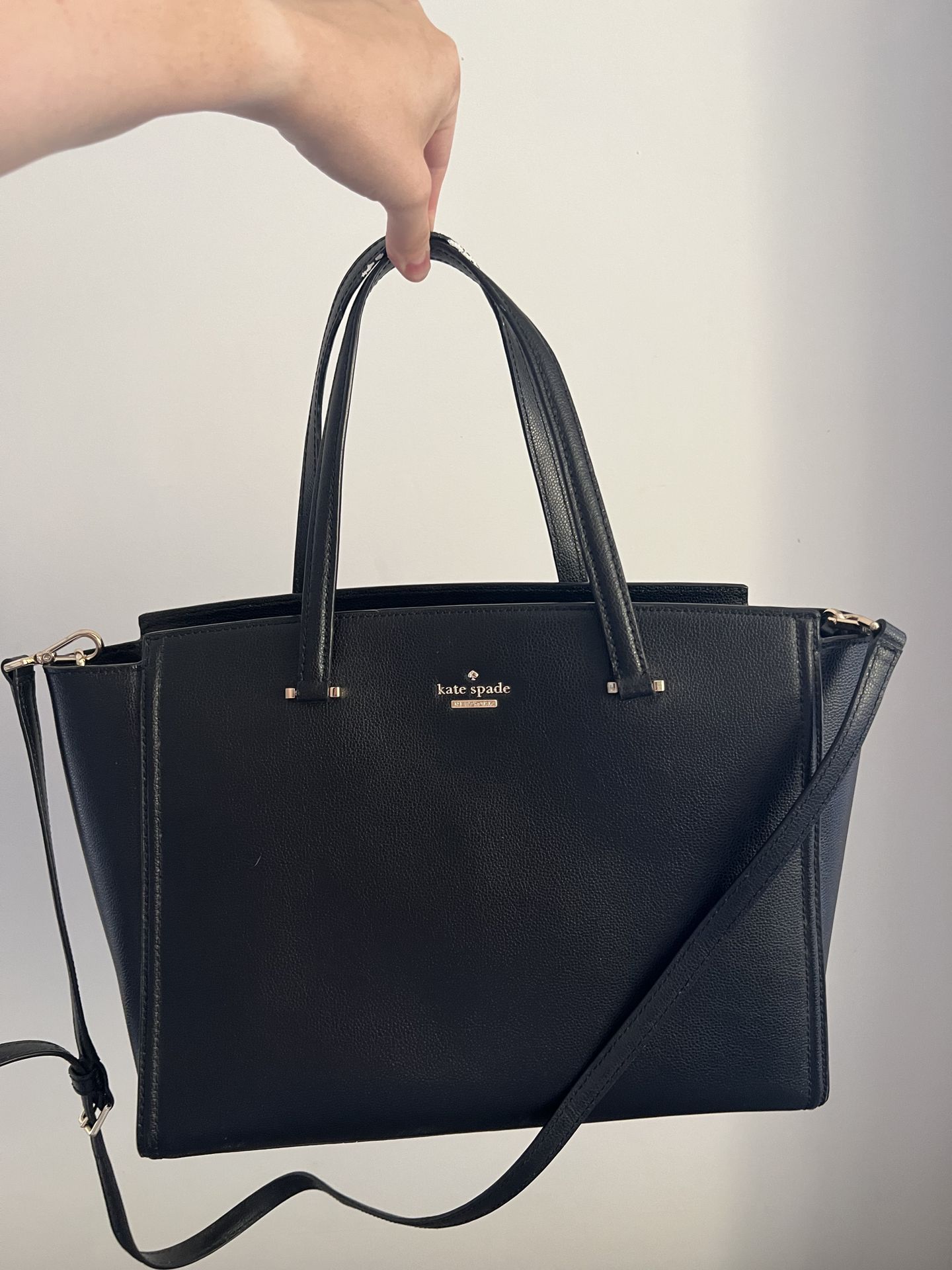 Black Kate Spade 100% cow leather shoulder bag. Used maybe once. Has a little bit of paint stuck to it from sitting in my closet but should clean easily.