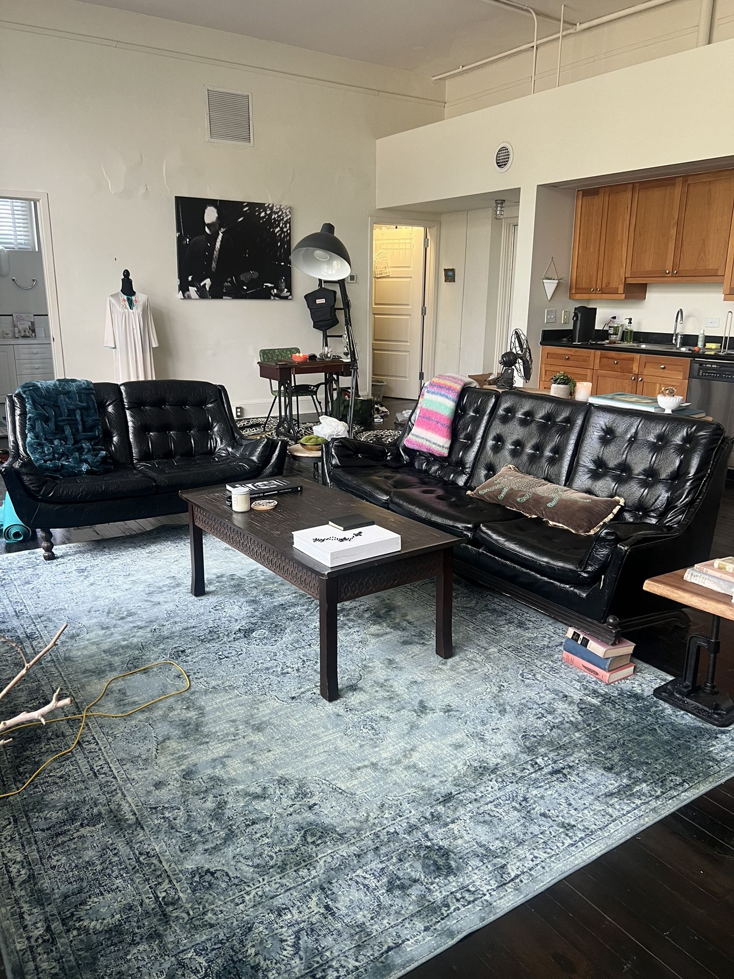 Vintage Mid Century Modern Black Leather Sofa, Love Seat, And MCM Hand Carved Wood Coffee Table