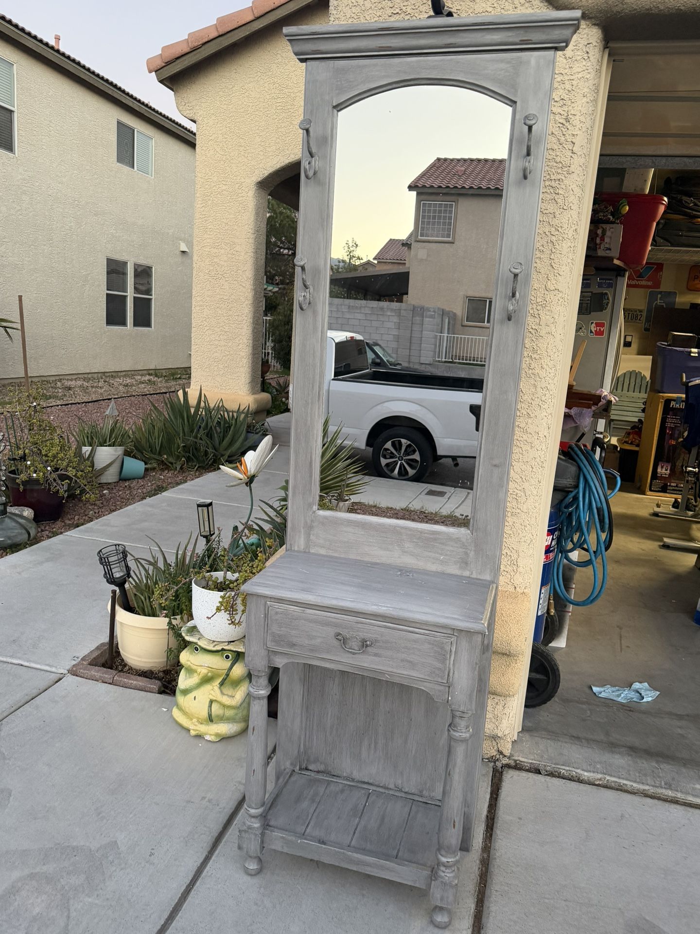 Charming hall tree for your entryway. Has a cool distressed grey finish. Comes with a mirror, 4 hooks for coats or bags, a small drawer, and a bottom shelf. No delivery pickup only Fort Apache and Alexander