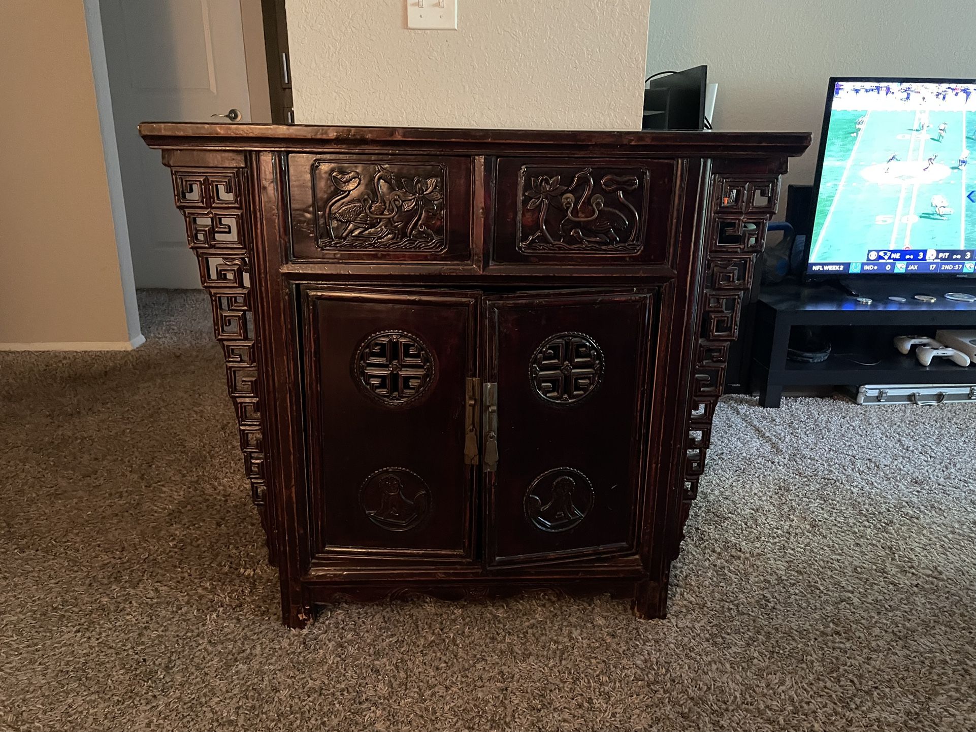 Antique cabinet from the 1700s China era. Approx 40 inches wide by 26 inches deep. We’ve used it as a TV stand the last couple of years. Paid 3500 for it from an antique store and will be willing to take best offer.