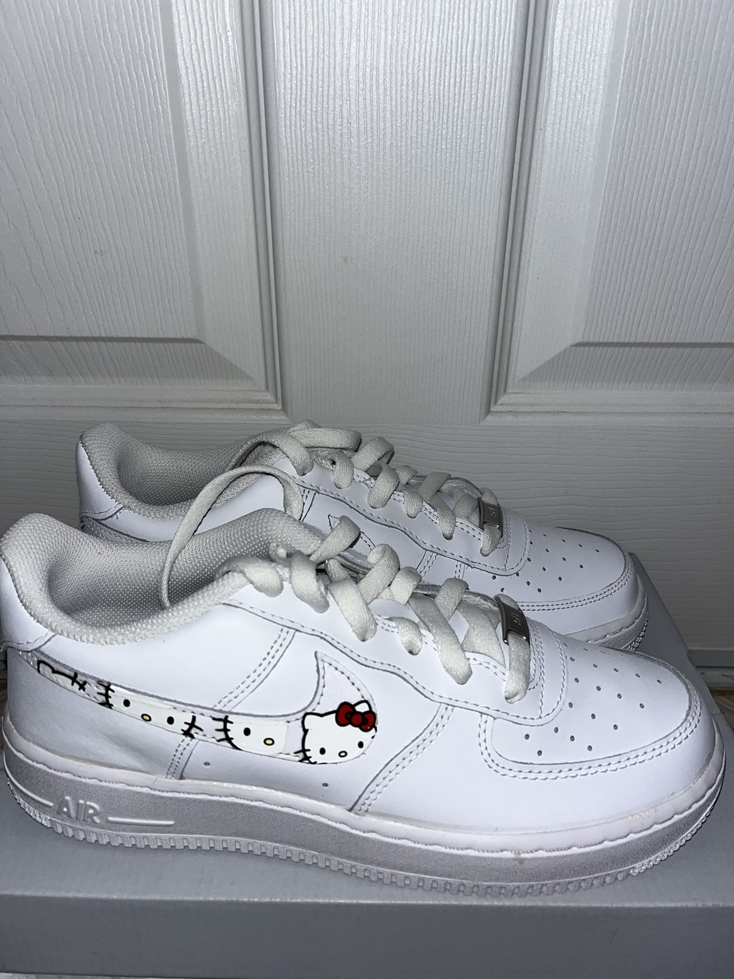 Custom air force 1 shoes with red bow hello kitty face on the outer face of the swoosh symbol. *Inner swoosh does not have HK face. Never worn, new in the box, only ever tried on. Boy’s size 6.5Y, women’s 8, and men’s 6.5. Feel free to message any questions or for additional images.
