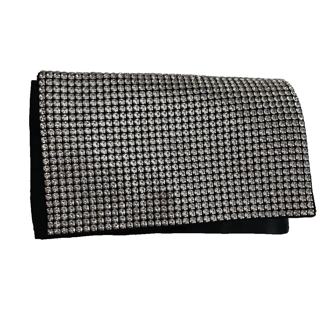 "Stella Crystal" Sparkly little evening bag Black satin, with a rhinestone covered front Magnetic, metal snap closure, lined in black, with 1 small inner pocket, and removable long, silver chain strap. Amber Sceats brand 7.75" x 5" New, without tags, chain strap is still in original plastic wrap.