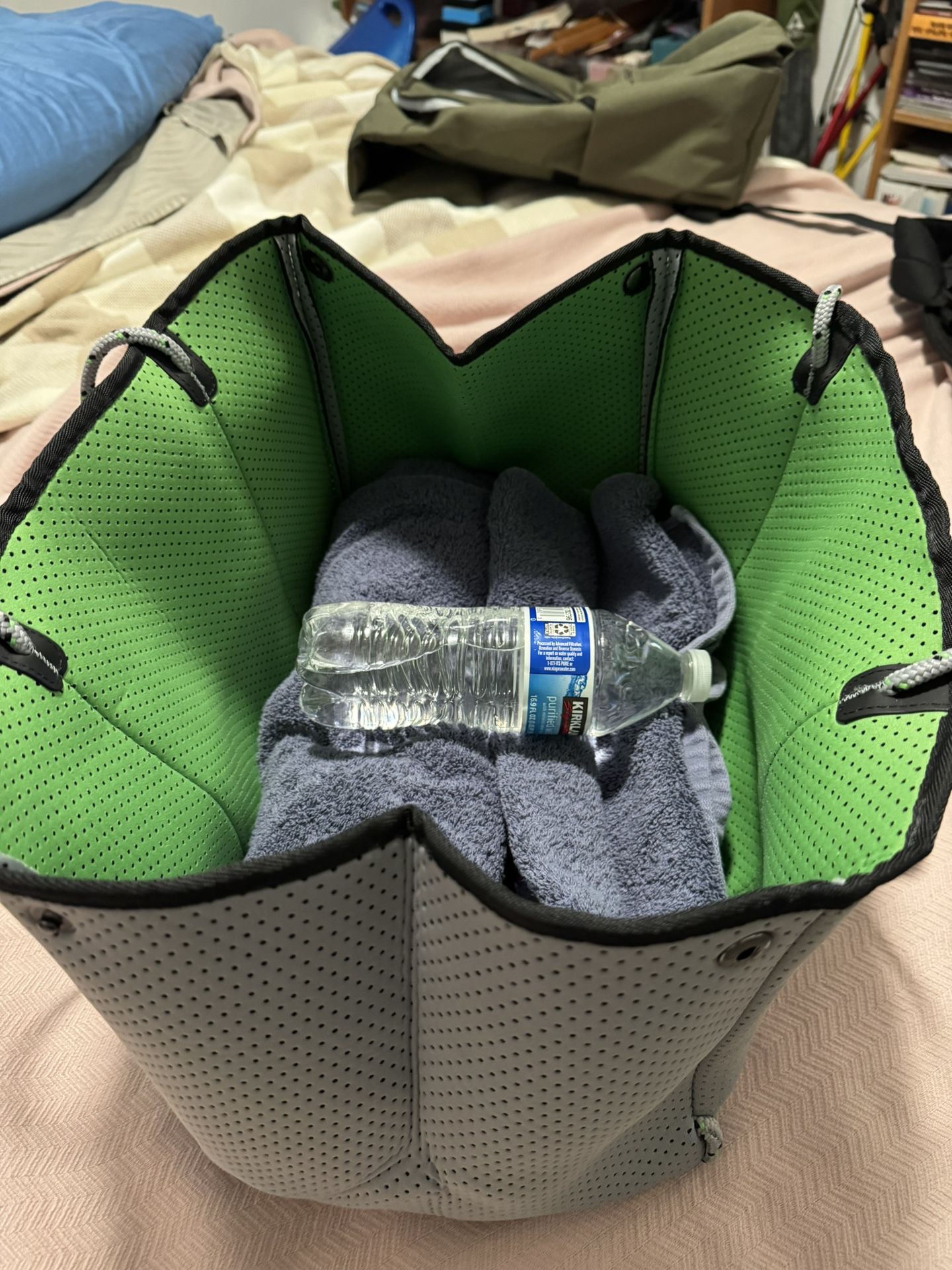 Neoprene bag, great for wet suits, towels. New, never used. Comes in mesh storage bag, includes smaller valuables bag. Large spacious bag.