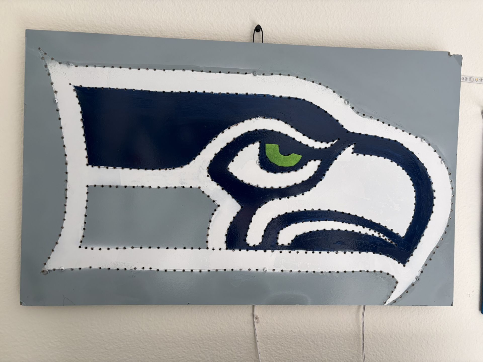 Wood sign with led lights behind it . Has a usb plug on the end . I just have it plugged into my tv. Go hawks. Let’s smash them patsies