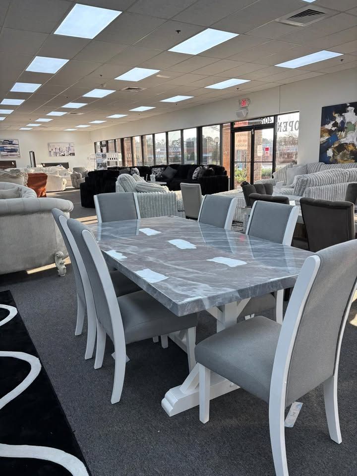 Features: Gray/White Faux marble top White Cross-legged Trestle Base Beveled Edges Fully Upholstered Seat and Backrest Dining Table Dimensions: L" 78 W" 40 H" 30 5 Pc Dining Set @ $875.00 (Includes: Dining Table + 4 Dining Chairs) 7 Pc Dining Dining set @ $1099.00 (Includes: Dining Table + 6 Dining Chairs) We offer various finance plans $39 down same as cash with no interest for 90 & 100 days. Longer financing plans are also available. Lowest prices, great quality products and exceptional service guaranteed. We also have a wide range of other living room, bedroom and dining room products to choose from at highly affordable prices. For buying visit Splendid Furnishings located at 4073 Lavista Road, Suite 311, Tucker GA 30084 or call 470-269-9301.