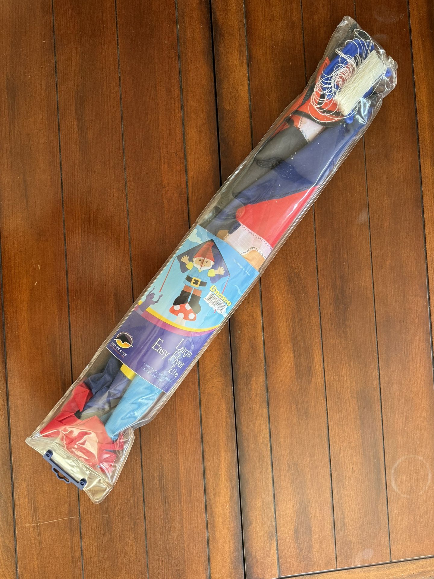Used a few times. Ready for a new owner. Gnome kite with great span and a long tail. Easy to fly for all ages.