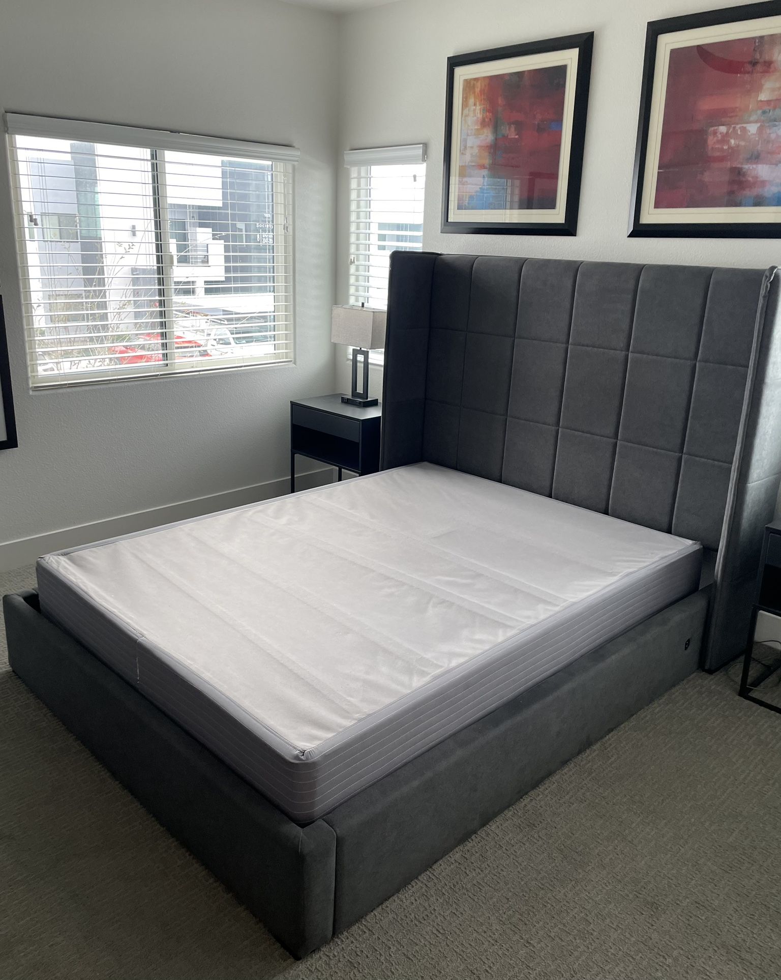 Modern queen-size bed frame in a stylish gray fabric finish. Features built-in USB charging stations on both sides of the bed, perfect for charging phones and devices overnight. Comes with the box spring included, so all you need is a mattress and you’re ready to go. From a smoke-free home and well maintained. Details: • Size: Queen • Color: Gray • Includes: Bed frame + box spring • Built-in USB charging stations (both sides) • Upholstered headboard and frame • Dimensions: 85” L x 70” W • Condition: Good, clean, and sturdy • Mattress not included Price: $300 Pickup only.