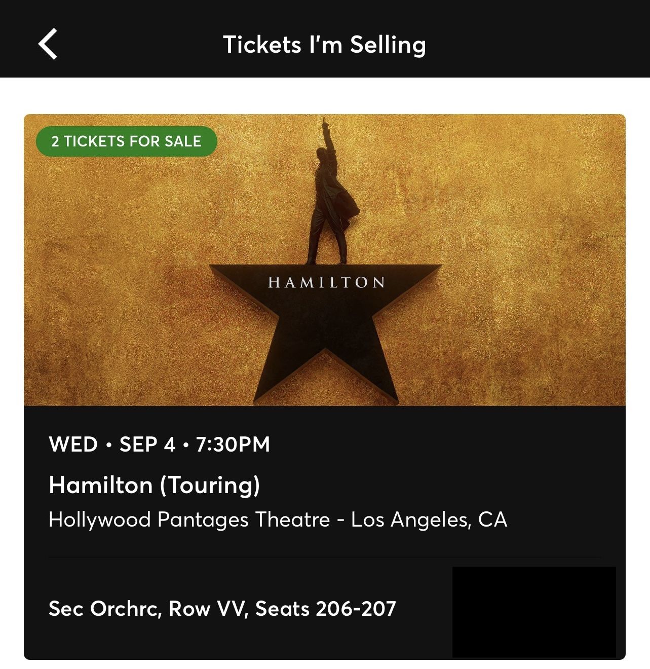2 tickets to Hamilton in Hollywood at the Pantages Theater this Wednesday September 4th. This is the best deal you’ll find for premium orchestra seats $200 each. I can transfer the tickets directly to your Apple Wallet or mobile transfer. Pay via Zelle, Venmo, PayPal, Apple Pay, CashApp or cash. I have these listed on Ticketmaster and StubHub, if you feel more secure doing a transaction through those sites and would rather spend more on fees, then I can link you to my listing there.