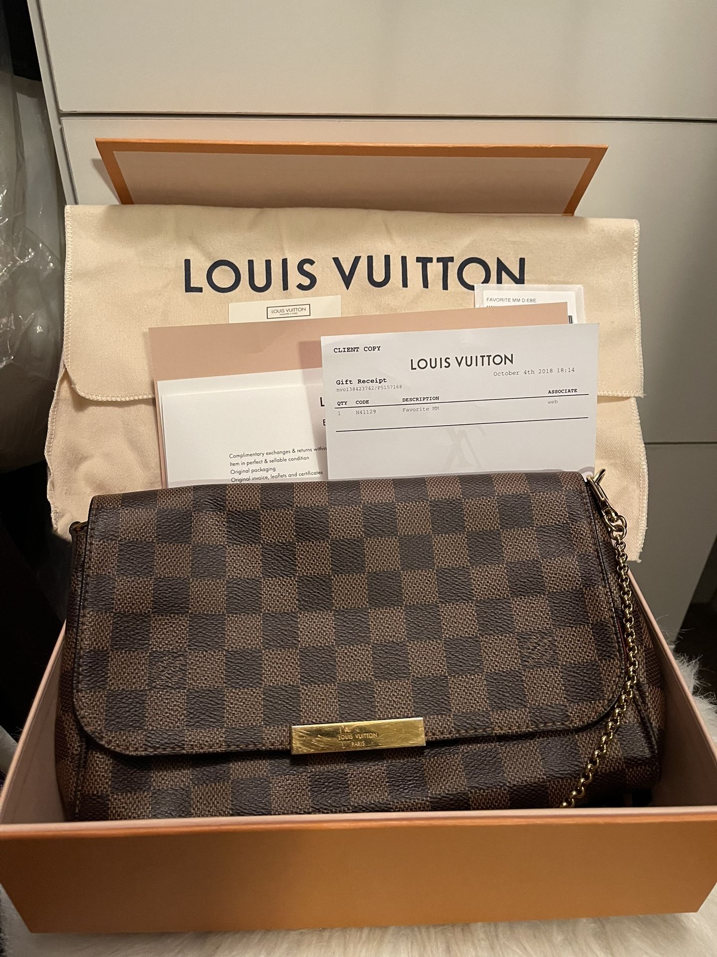 Wear it as a clutch or a crossbody. Purchased in 2018 and only used couple times. Nothing wrong with it. Comes with box, dust bag, bag and receipt. 100% authentic Louis Vuitton Favorite MM