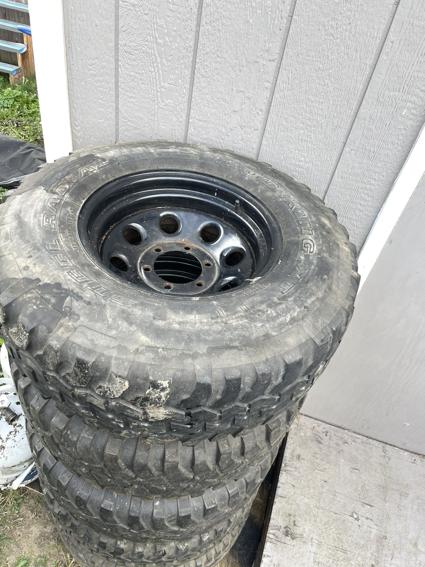 4 wheels with tires plus one spare tire. 31/10.5/15 Wheel pattern 6x6.5 The tires will probably need replacing.