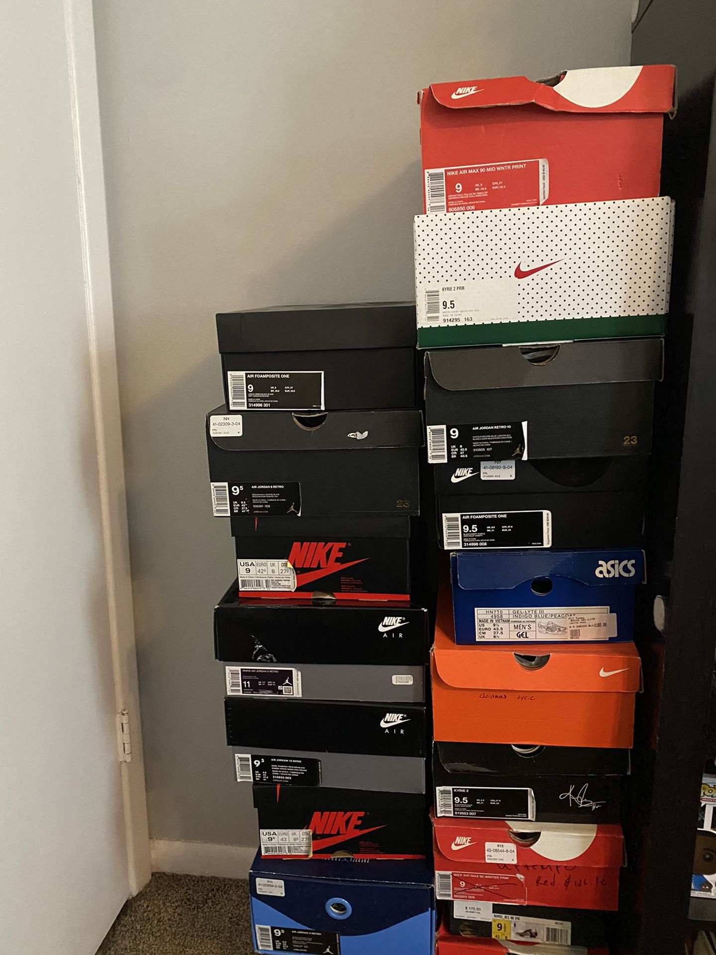 Selling a portion of my collection, all 9-9 1/2These are my personal sneakers that I have kept in great condition. All sneakers have been taken car of and cleaned after use. About 3 of them are not in the original box. Look at my page and for individual pictures and prices. Nike, retro Jordan’s, adidas, ASICS.