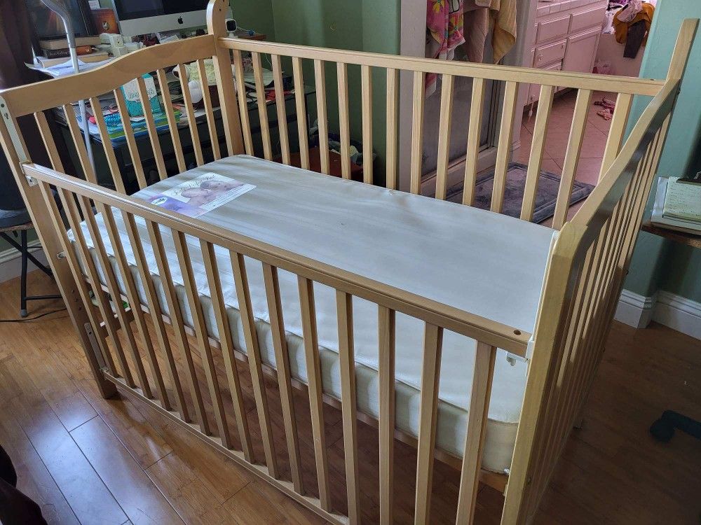 Used, very nice condition crib. Missing rear top rail, can see in photos. May throw in the matching changing table if I can find it. The back rail for the crib might be with the changing table.