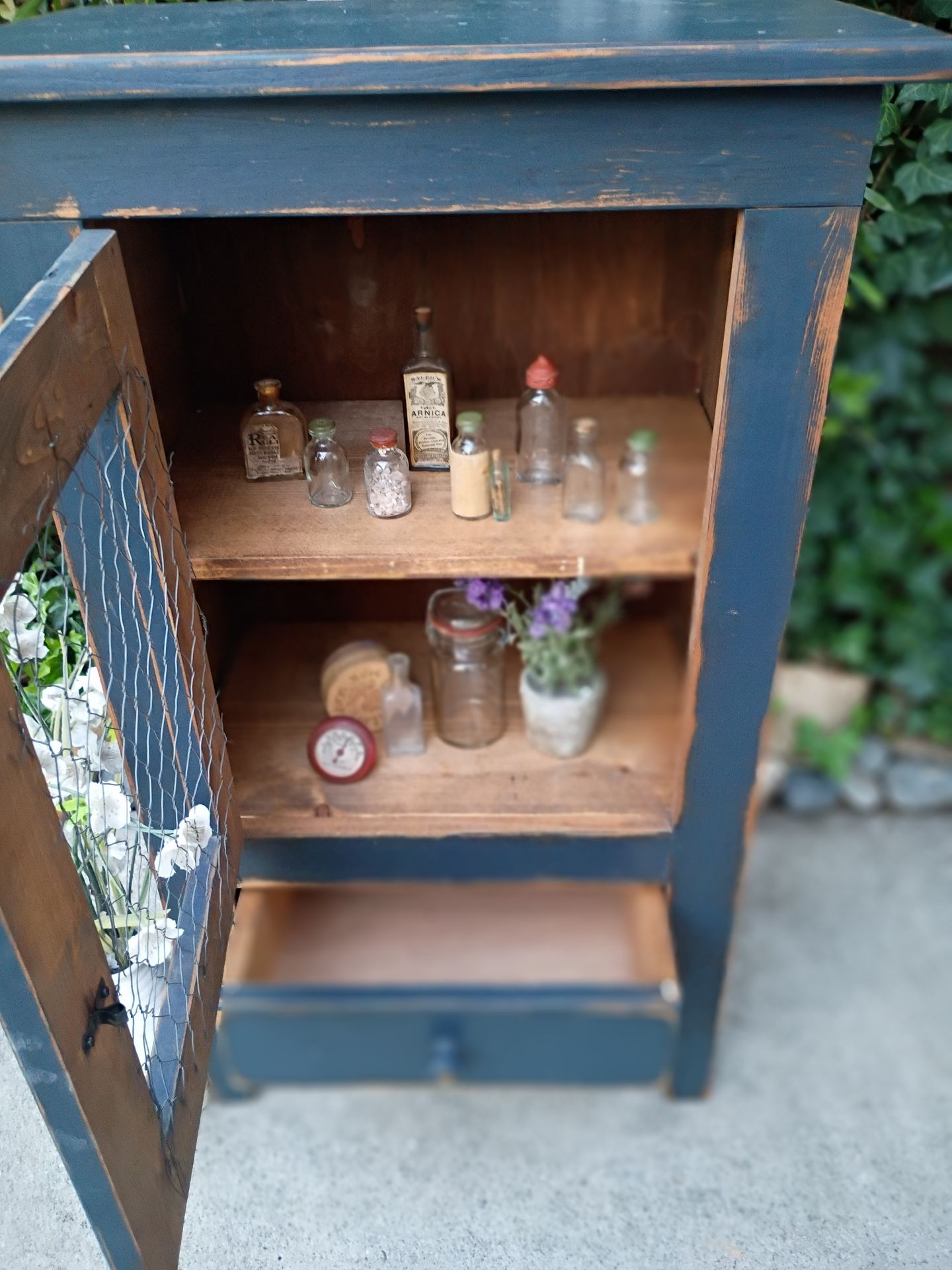 Antique Cabinet Rustic Chicken Wire - Shelves - Spacious Storage Drawer Measures 21" W X 13" D X 36" T Farmhouse Cutie