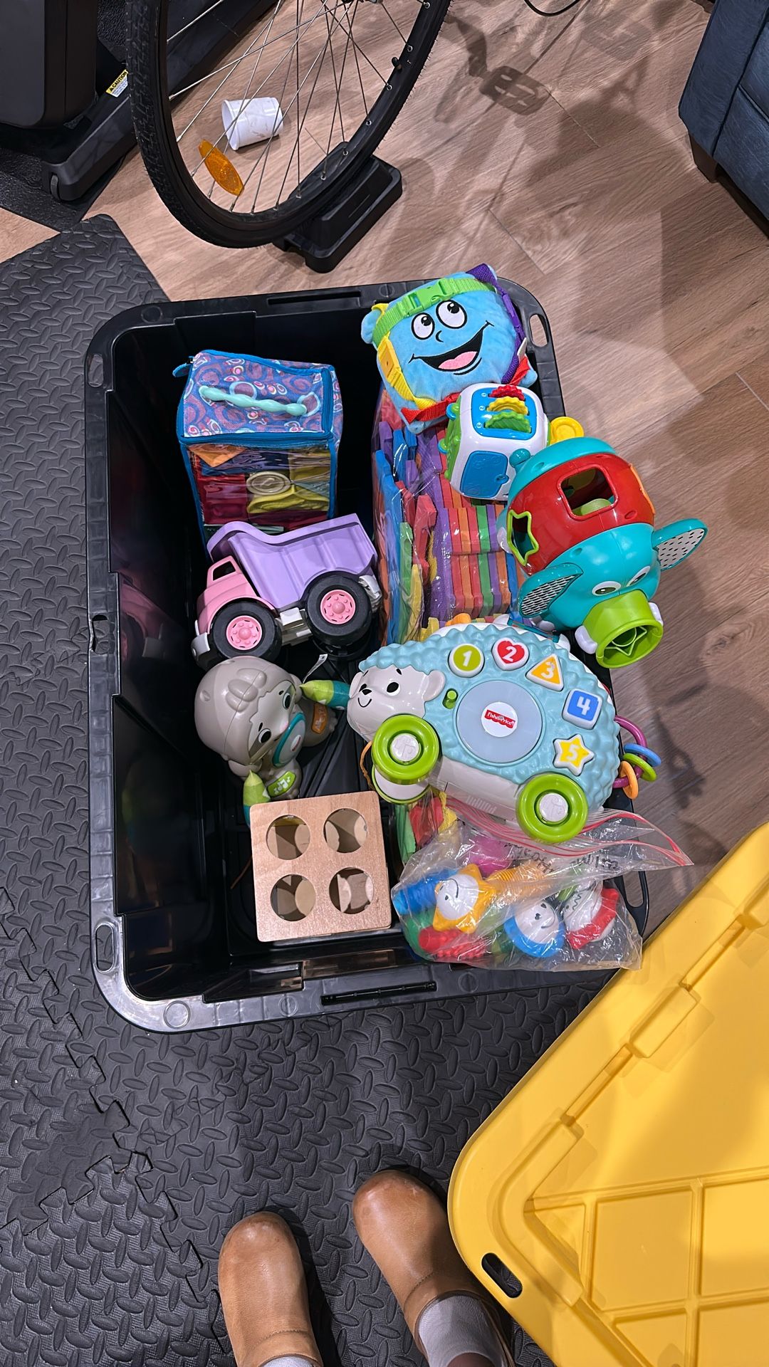 Soft blocks, two talking animals, k w shape sorter, foam puzzle mat, tonka truck