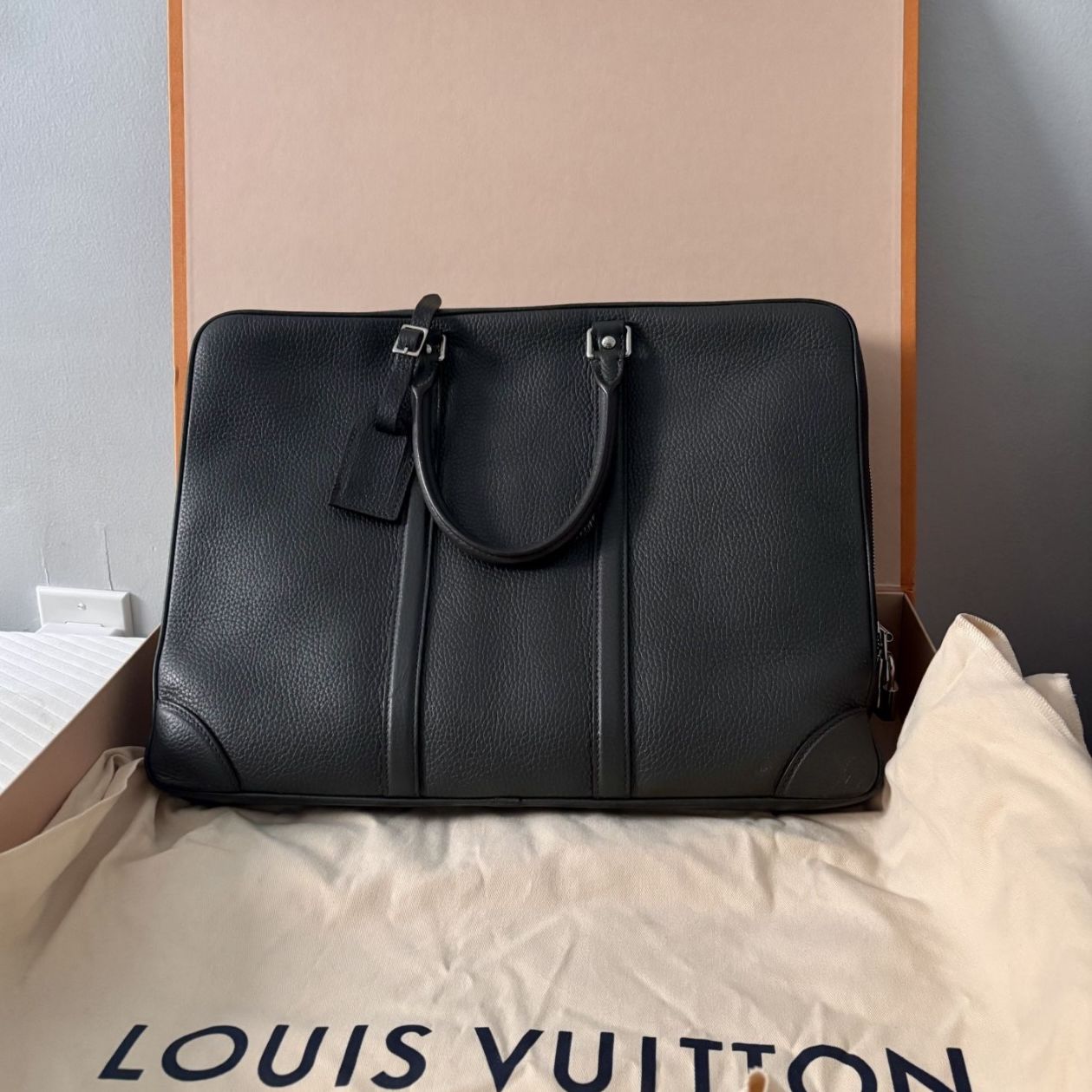 Authentic Louis Vuitton Porte-Documents Voyage (PDV) in Taurillon leather, Anthracite (dark grey), made in Italy (2014). Original retail price was $4,400 USD. This briefcase is crafted from premium full-grain Taurillon calf leather and features a structured design with smooth zip closure, sturdy leather handles, and a spacious interior that fits most laptops under 15 inches. Perfect for professional or business use. The bag shows light wear marks consistent with normal use (please refer to photos), but overall remains in very good condition. No major damage. Clean interior. A timeless, high-end piece that still makes a strong statement.