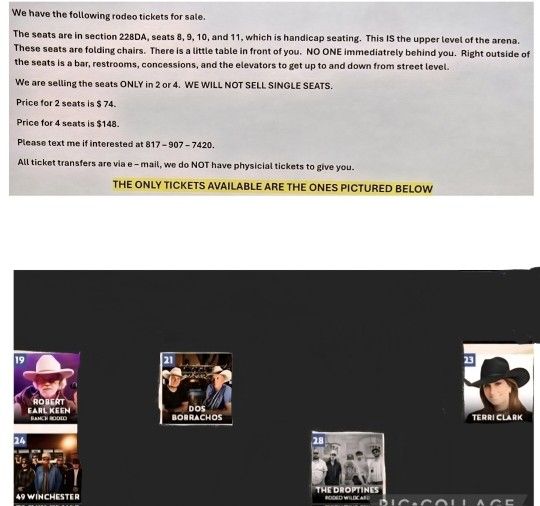 We are selling some of our rodeo tickets. They are in section 228DA, which is handicap seating. These seats are in the upper level. They are folding chairs. There is a little table in front of you, and no one behind you. Right outside of the seats is the restrooms, a bar, and the elevator to get you back to the main / street level. We are willing to sell the tickets as a pair, or all 4. We will NOT sell single tickets. Price for 2 tickets is $74, price for 4 tickets is $148. The shows listed for sale, have all 4 seats available, EXCEPT Robert Earl Keen, and there are 3 tickets available for that show.