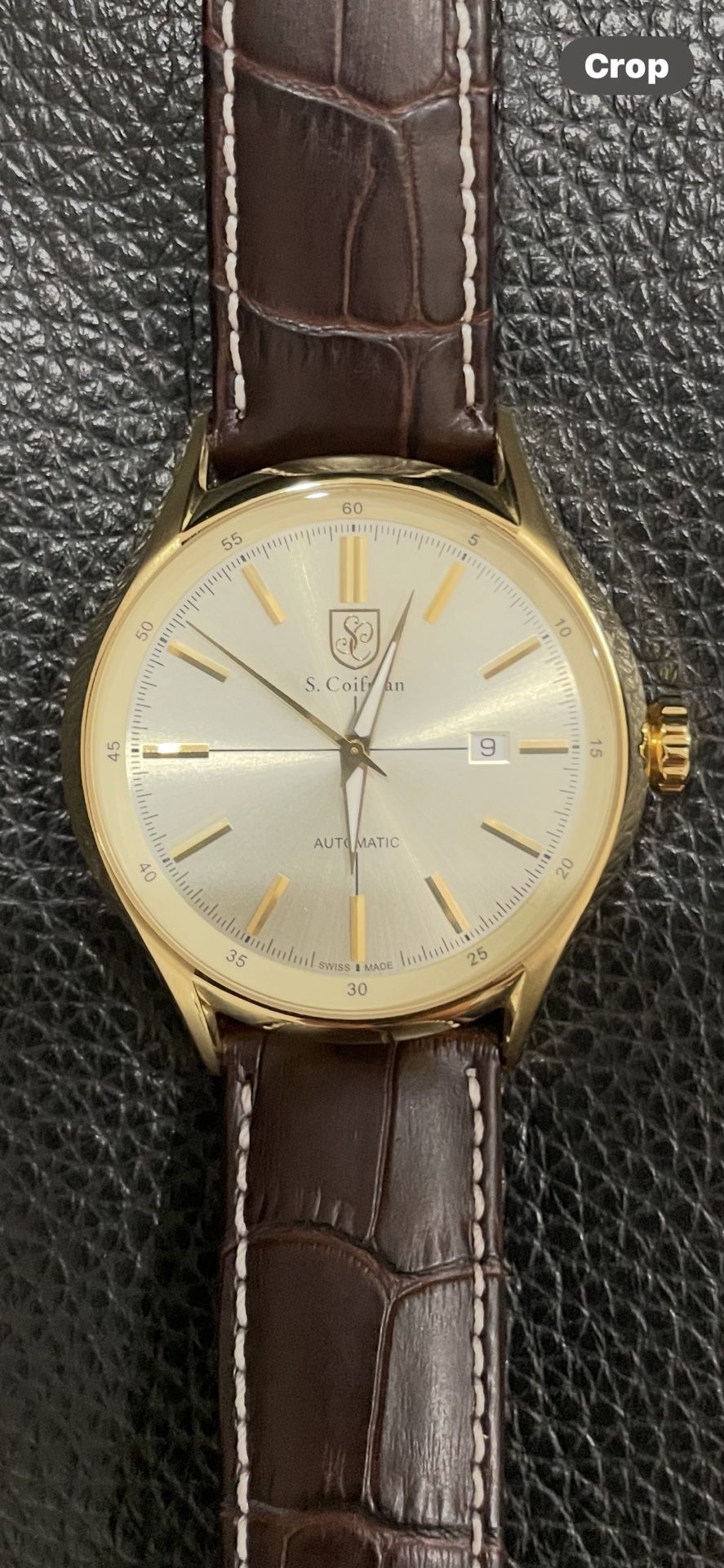 Classic design men’s dress watch with updated slightly larger size than the tiny dress watches of the past. S. Coifman automatic watch Swiss automatic caliber Sellita SW200 movement. Model SC0079 Goldtone with Champagne color dial Case size: 45mm Water Resistance: 50 meters Flame Fusion Crystal Leather band width: 22mm Butterfly clasp Brand new condition but without original box MSRP from S. Coifman is $1125