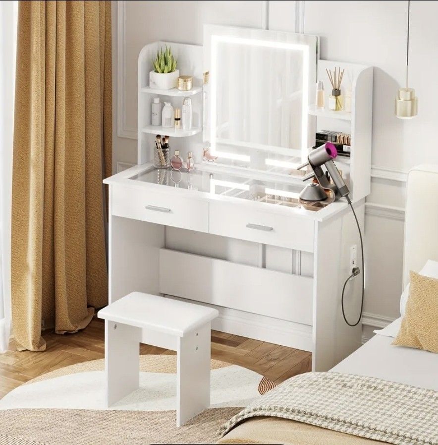Brand new in box β UNOPENED β¨ Full size makeup vanity with LED mirror Glass tabletop + matching chair included Built-in power outlet for hair tools & chargers Measurements are in photos β check dimensions π π Pickup in East Wenatchee (Rock Island Rd area)
