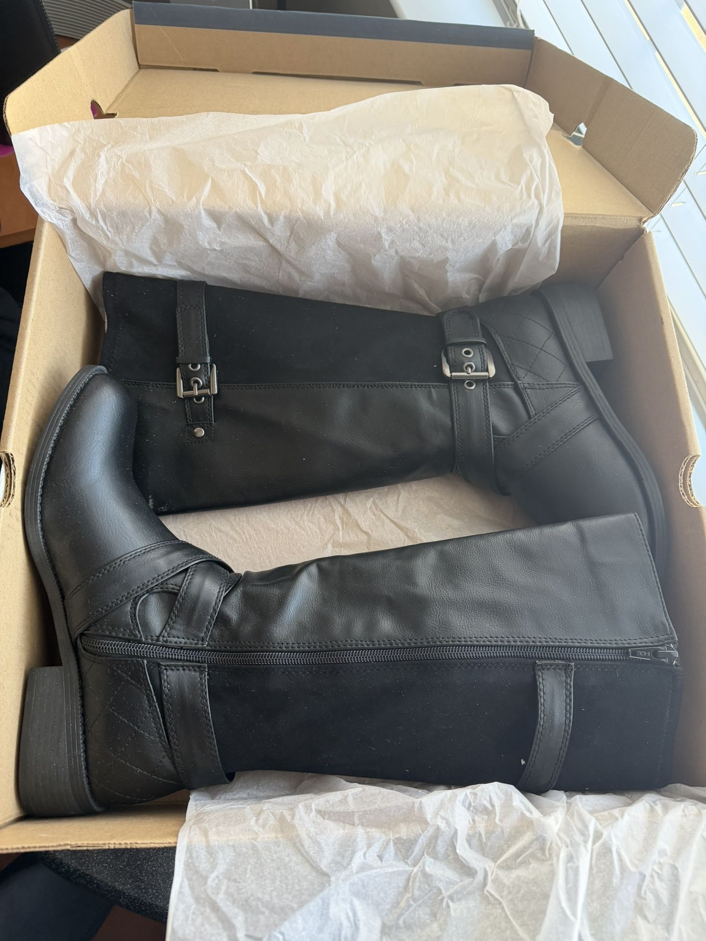 Size 9 Style Austin, brand ALEXIS nice black lady boots brand new in the box purchased at $99.00 Bonitas Botas negras para damas tamaño 9 marca Alexis y el estilo es Austin, fueron compradas en Dillard’s, parte cuero a y parte felpa todo negro convidado! Muy bonitas nuevecitas en su caja!