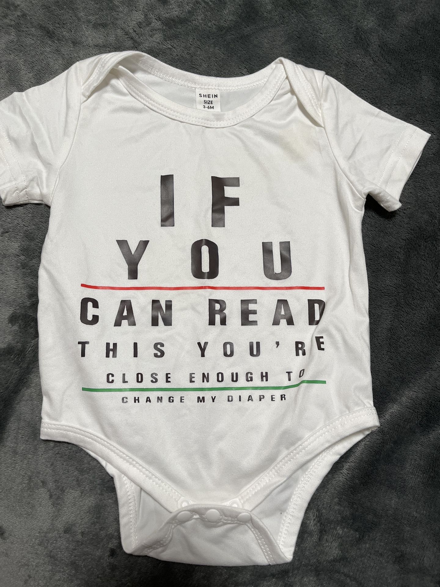 I'm selling a white Shein baby onesie. It says, "If you can read this you're close enough to change my diaper." It's size 3-6M