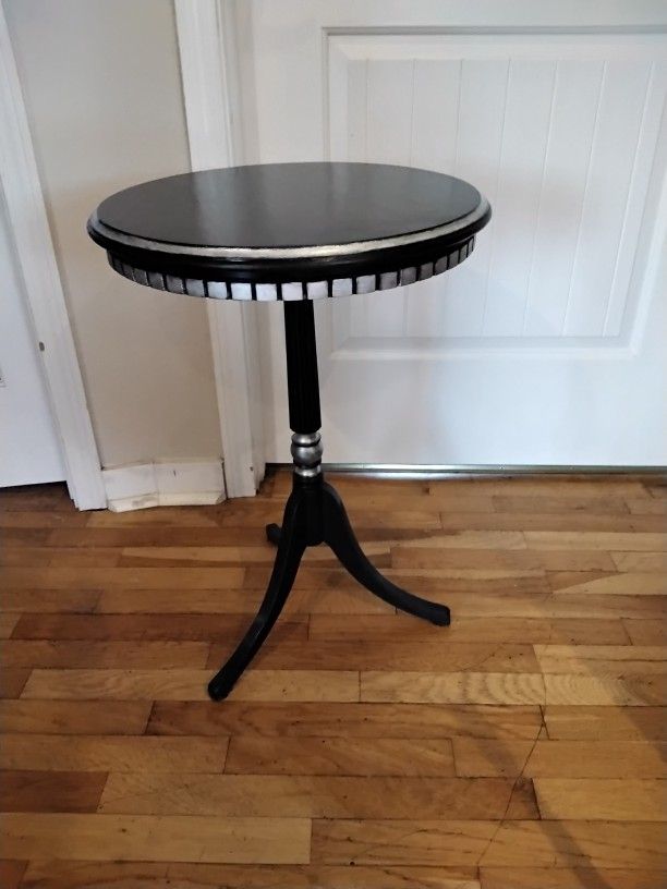 Refinished black with blue undertones and silver round table. 26"x18. #2115-85