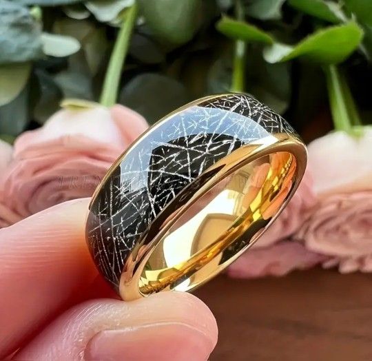 Men's Women's 8mm Tungsten Gold Black Meteorite Inlay Comfort-Fit Engagement Wedding Band 11