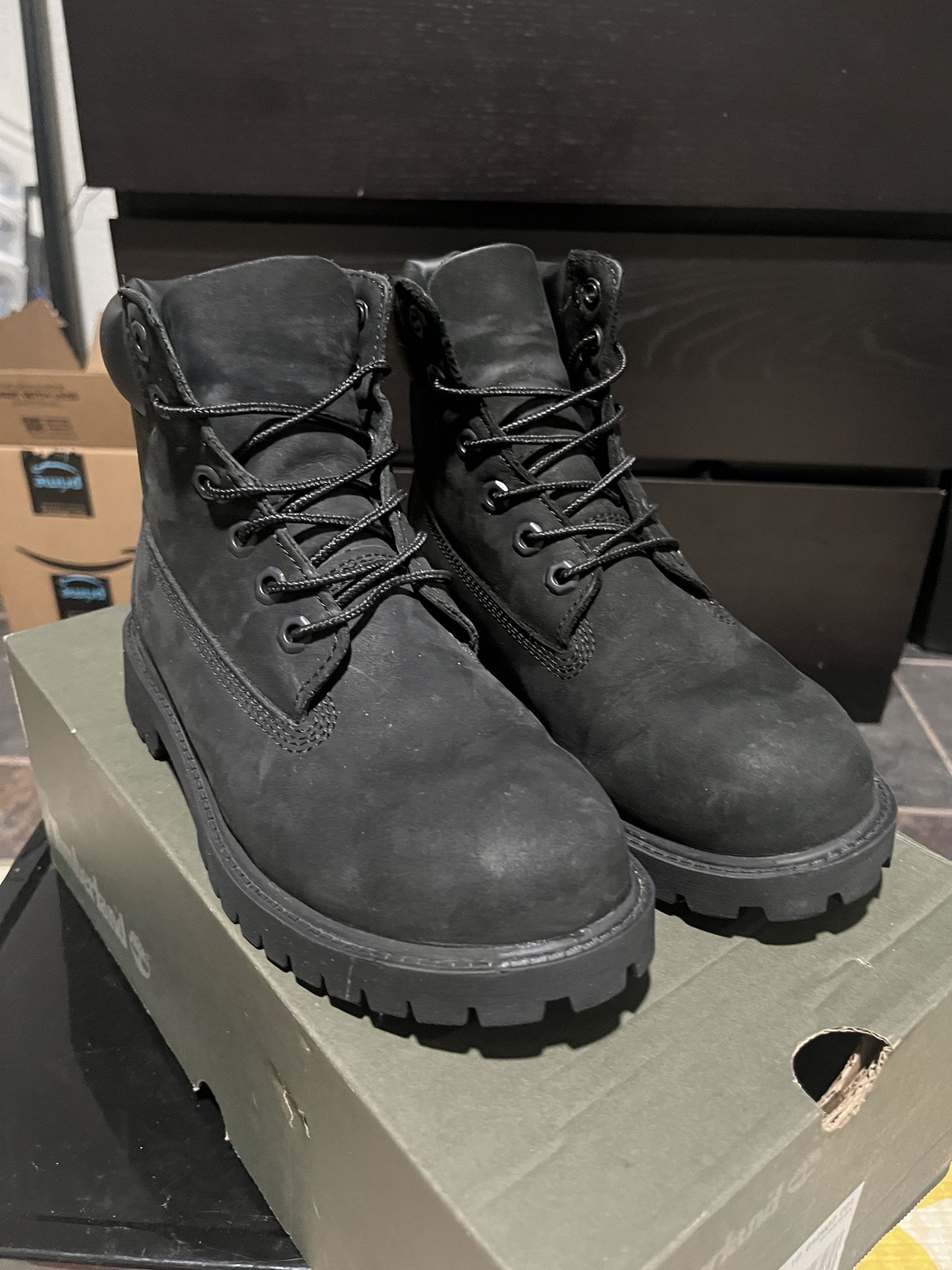 Bought from the Timberland website All black Timbs 6inch waterproof boot Black nubuck Comfortable and keeps feet dry and warm Men’s/ boys 4 22.5 cm Appears blacker in person