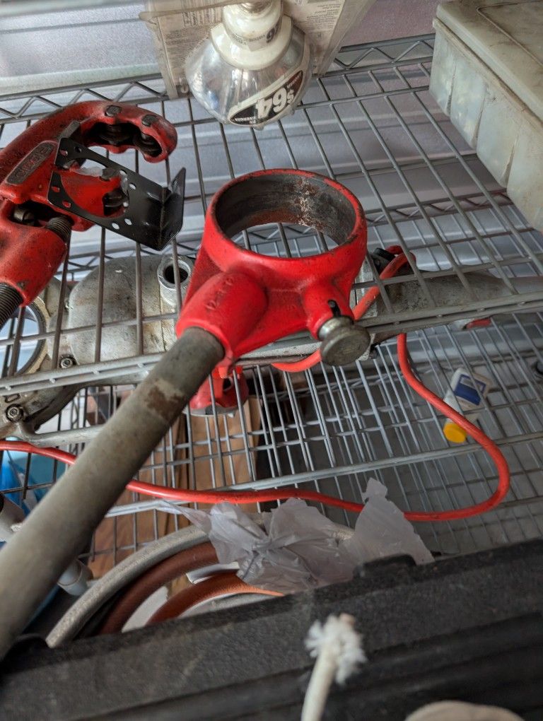 Rigid 700 pipe threader with threader heads from 1/2 inch to 2 inches, along with manual ratchet, and pipe cutter.