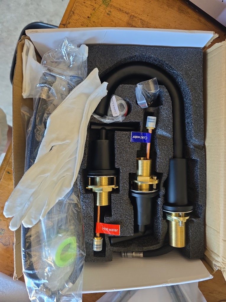 Brand new black, three hole faucet, modern design, brand new. Includes pop-up, easy, remove for cleaning with pop up drain pipe
